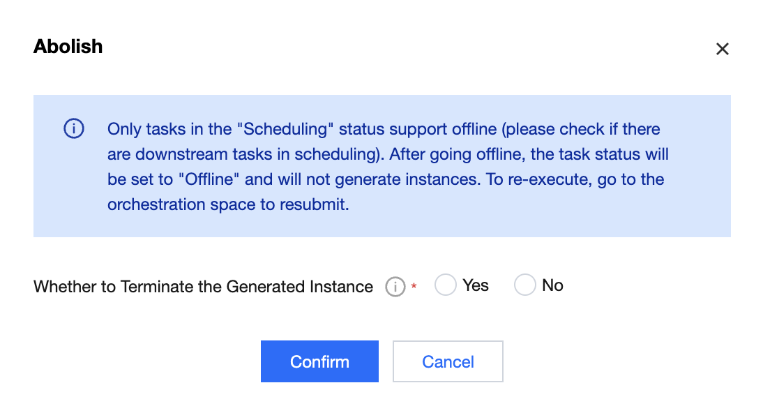 Take All Offline | Taking all offline will decommission tasks under scheduling in the workflow. Decommissioned tasks will not be able to run. Only workflows with the status "Scheduling All" and "Scheduling Some" support the take all offline operation. In the offline operation, you can choose whether to terminate the generated instances. If you choose yes, non-final state instances will also be terminated during the offline process. ![]() |