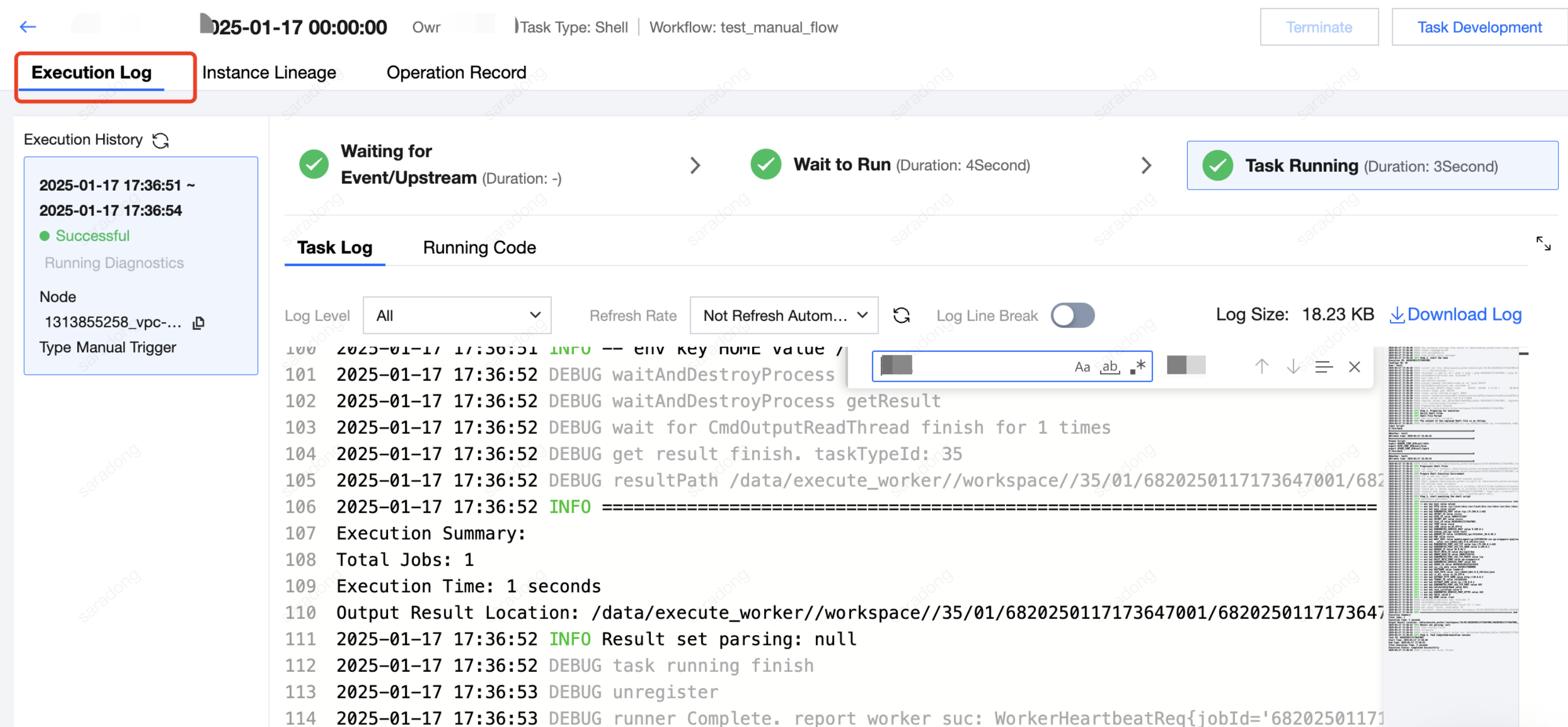 Execution Log | View the full process of each execution after the instance is generated, including waiting events/upstream, pending execution, start time of running, end time, time consumption, specific situation, execution logs, and execution code. Execution List: The rightmost side is the record list of each instance execution. Each manual triggering, rerun, or retry will be recorded as an execution. Execution Information: Each execution's basic condition can be viewed in three stages: waiting events/upstream, pending execution, and task running Waiting Events/Upstream: Display the direct upstream instances/events list and their statuses, facilitating quick identification of blocking instances/events. Pending Execution: Waiting to be dispatched to the execution engine. Task Running: Already dispatched to the execution engine and began execution; execution logs and execution code can be viewed. ![]() |