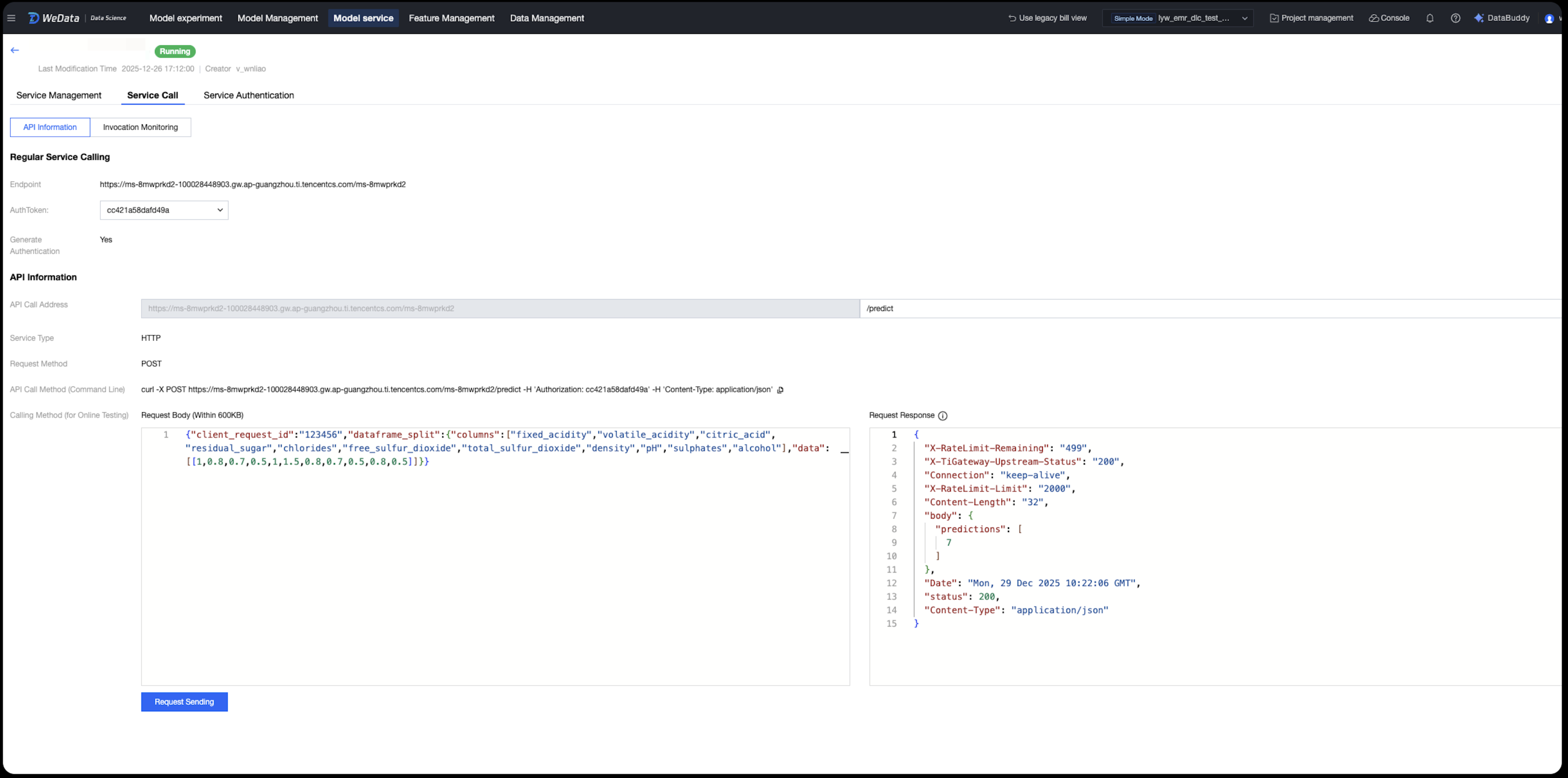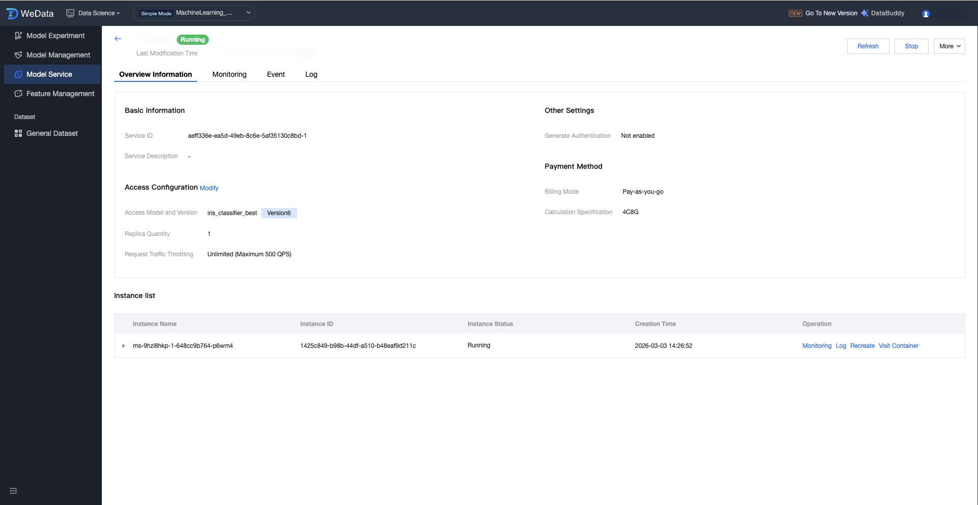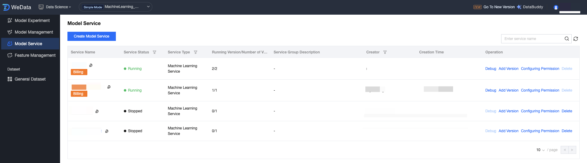 Service Name | | The unique identifier name of the model service. | It is advisable to name according to business purpose. Click to go to the service details page. |