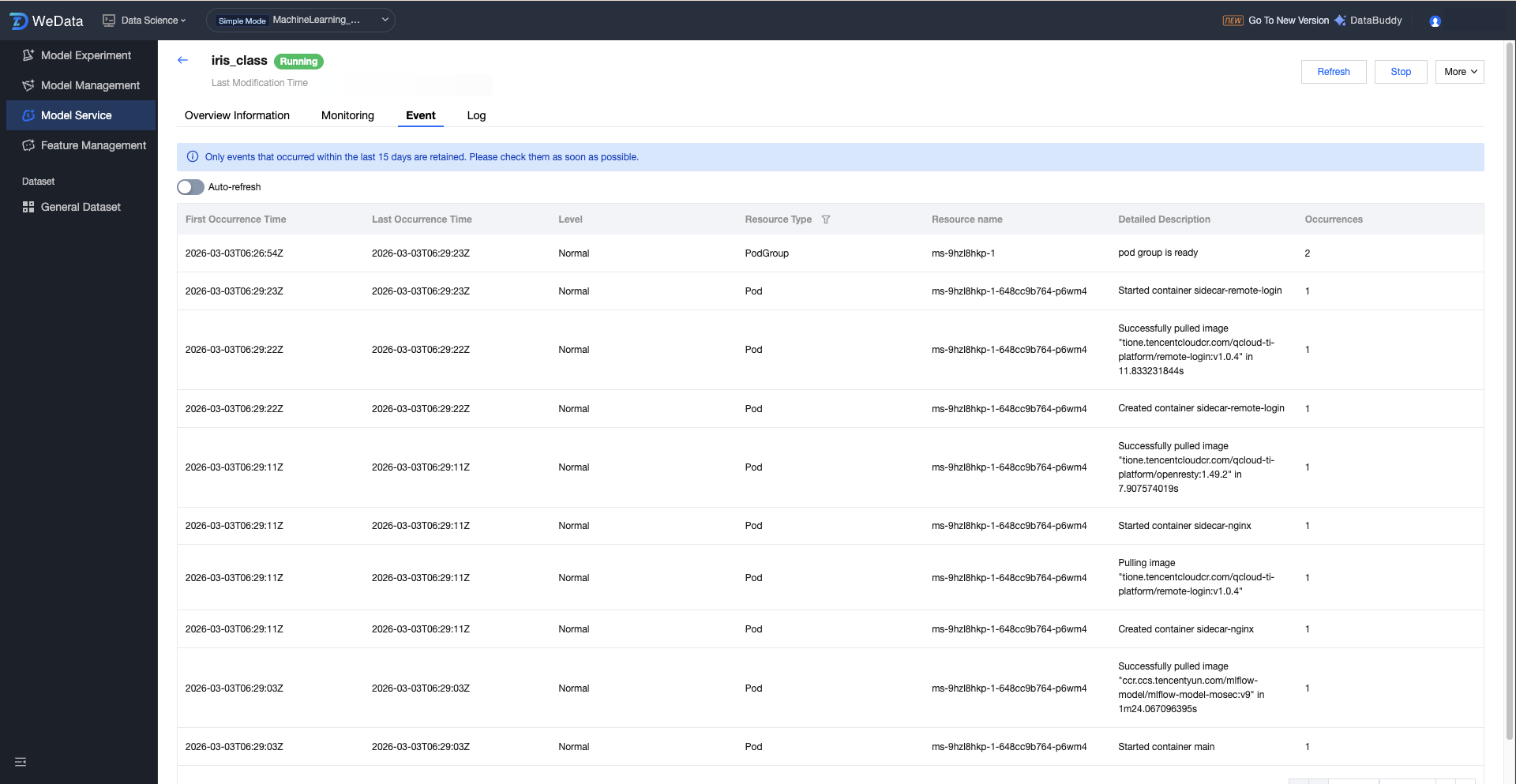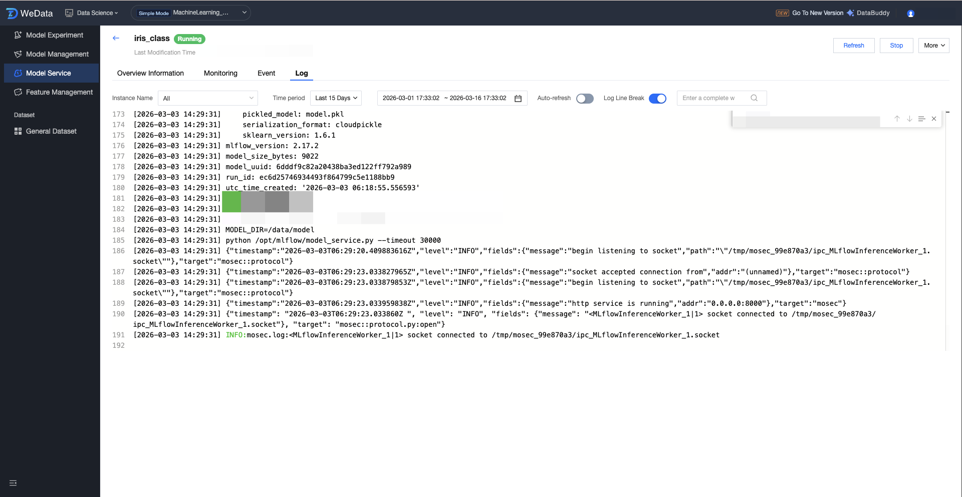 | Logs | Retrieve the running logs of the service instance. | Used to troubleshoot runtime issues such as model code errors and input/output exceptions. |
