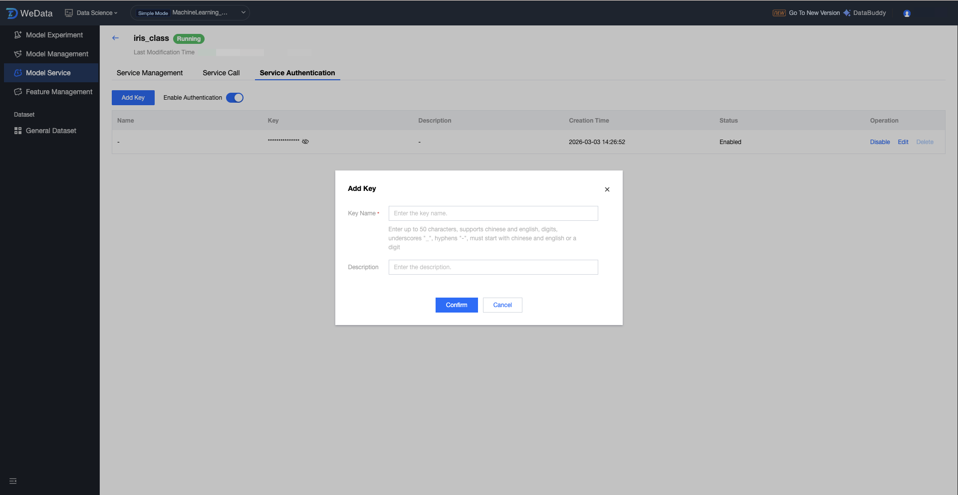 Generate Authentication | Service security control switch. | Display whether signature authentication (API Key) is enabled. If not enabled, the address can be accessed directly. |