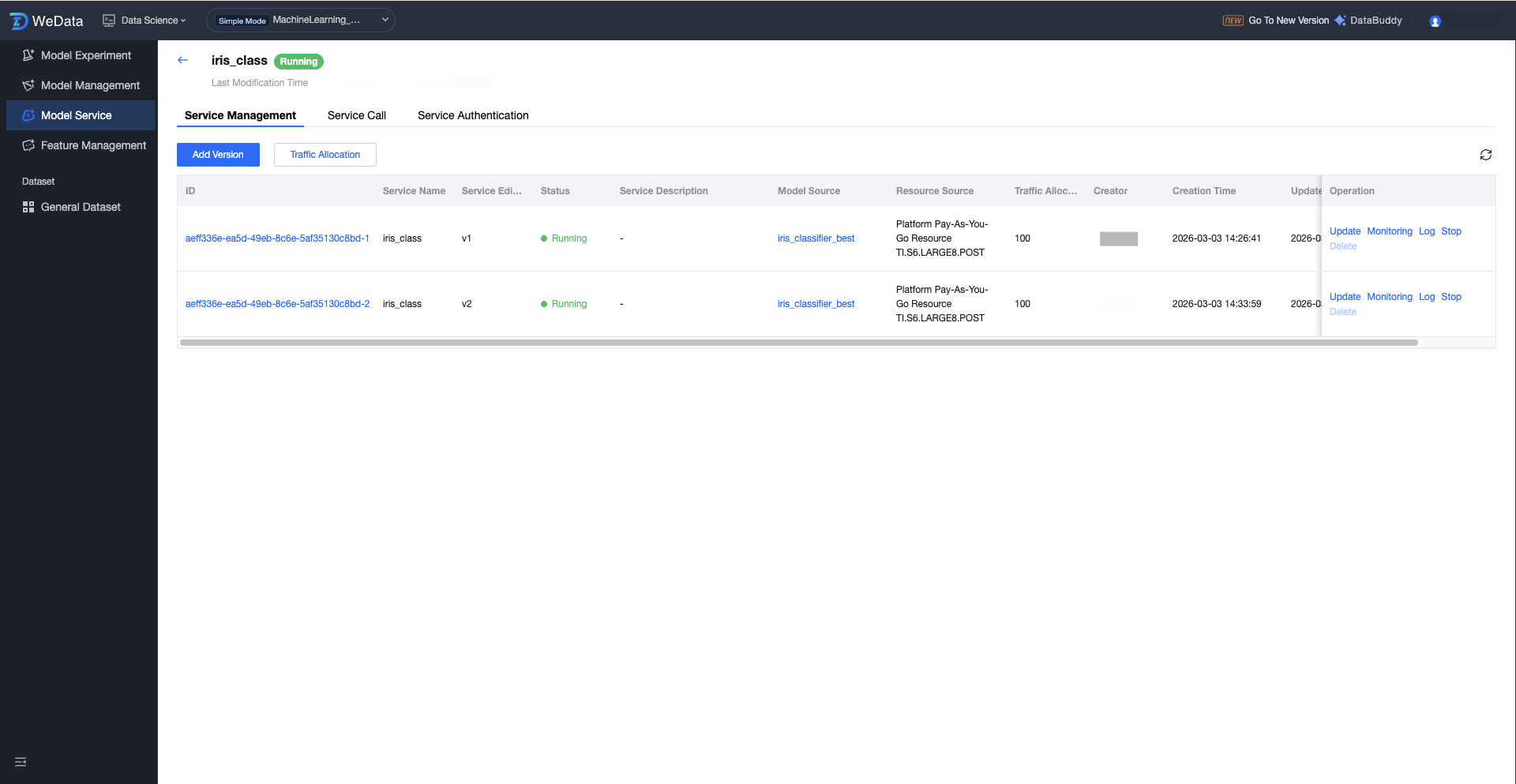 Operation | Updating | Modify the configuration message of the current service version. | View service version details, support updating version description and parameters such as resource configuration. |