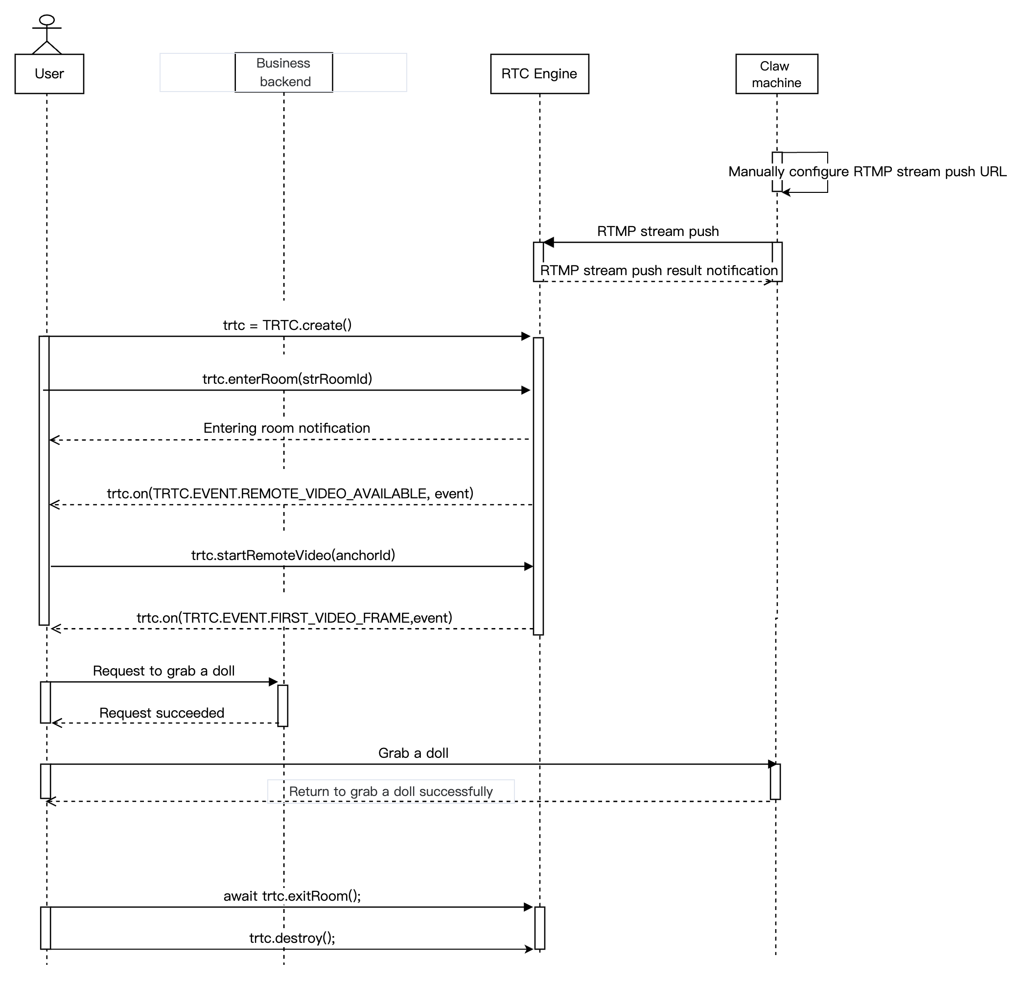 아래 그림은 온라인 클로 머신의 RTC Engine 스트리밍의 시퀀스 다이어그램을 보여주며, 여기에는 네트워크 카메라 RTC Engine 스트리밍, 사용자 스트리밍 풀링 등의 프로세스가 포함되어 있습니다.