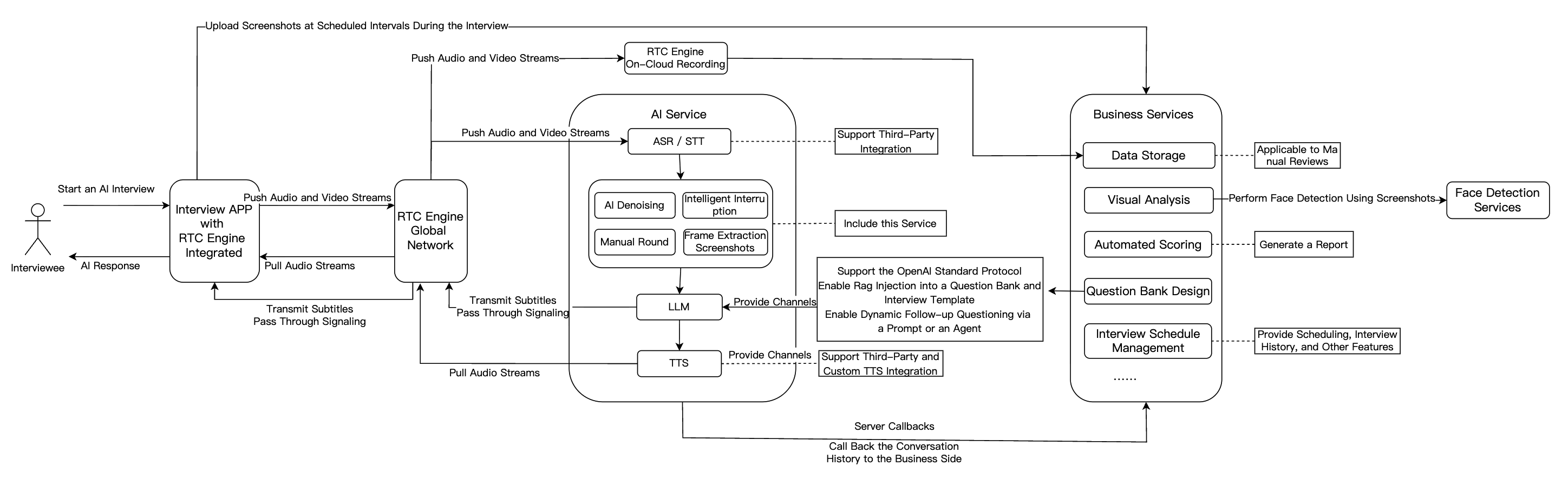 RTC | RTC Engine 기반으로 고수준, 저지연 음성및 영상 연결을 제공하며 720P/1080P/2K 고화질 및 48kHz 고음질을 지원합니다. 네트워크 환경에 관계없이 원활한 연결을 보장하여 실감적인 면접을 시뮬레이션합니다. |