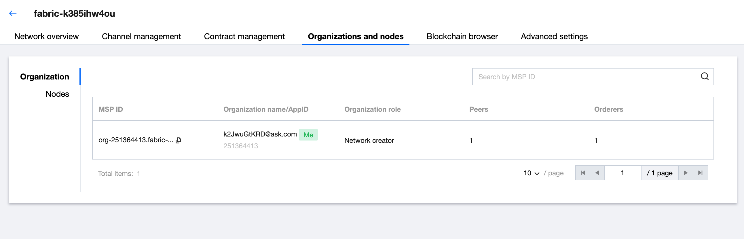 3. Select the Organization and Node > Network Organization tab to enter the organization list page. You can then view the organization information in the current network, including MSP ID, organization name, number of nodes, etc. When an organization is invited to join the channel, it will also be synchronized to the network and can be viewed on the network organization page. As shown below: