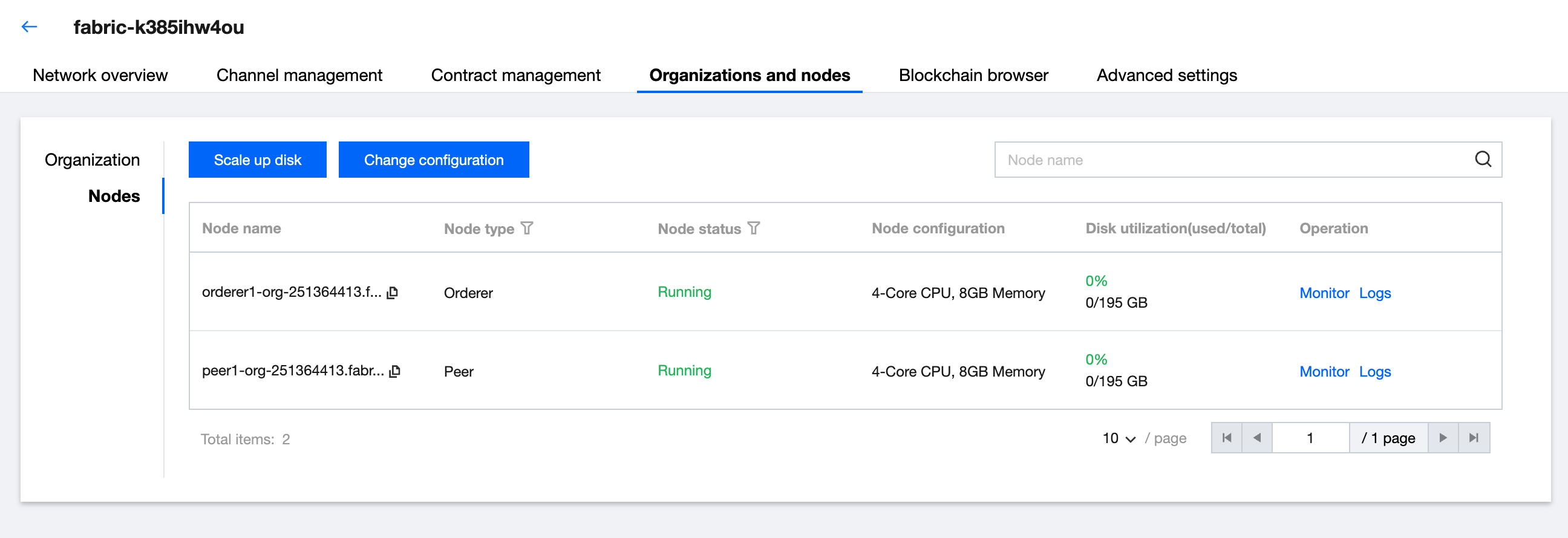 1. In the TBaaS Console, select Fabric > Blockchain Network in the left sidebar to enter the network card page. Click the corresponding card to enter the network details page. 2. Select the Organization and Nodes > Node Management tab to enter the node list page. You can then view the information of all nodes belonging to the current organization, including node name, node type, and node status. As shown below: