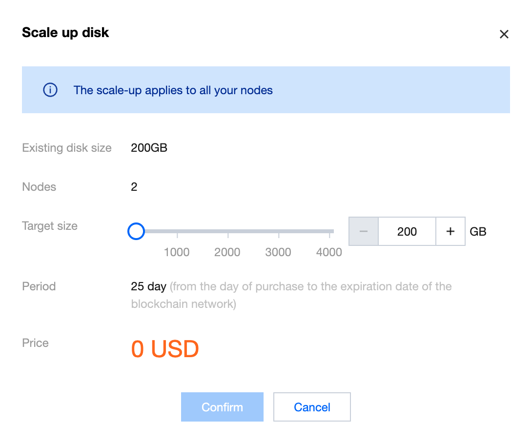 2. Select the target capacity size in scale up disk capacity to initiate the adjustment. The deployment process will start after procurement. The adjustment will take effect on all nodes belonging to you. As shown below: