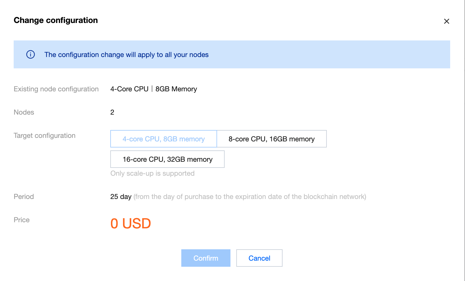 2. In Change Configuration, you can adjust the node specification size. Select the target configuration to initiate the adjustment. The deployment process will start after procurement. The adjustment will take effect on all nodes belonging to you. As shown below: