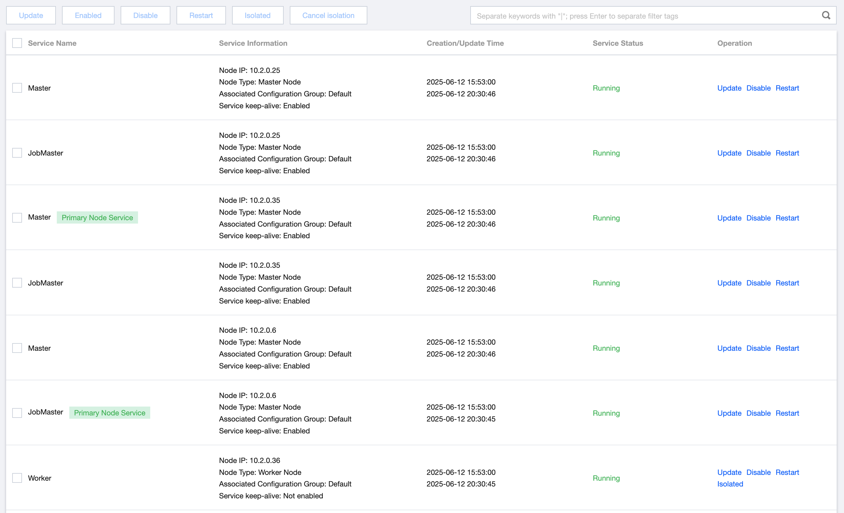 Enable: Enable services on nodes. Services on abnormal nodes or suspended service nodes can be restarted through this operation.