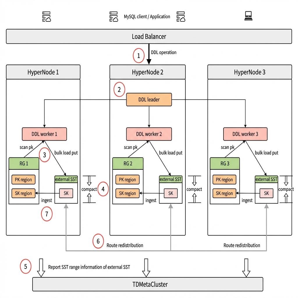 1. The user initiates a DDL operation request, which is randomly routed through the load balancer to a peer node in the TDSQL Boundless instance. Here, it is assumed to be routed to HyperNode 2.