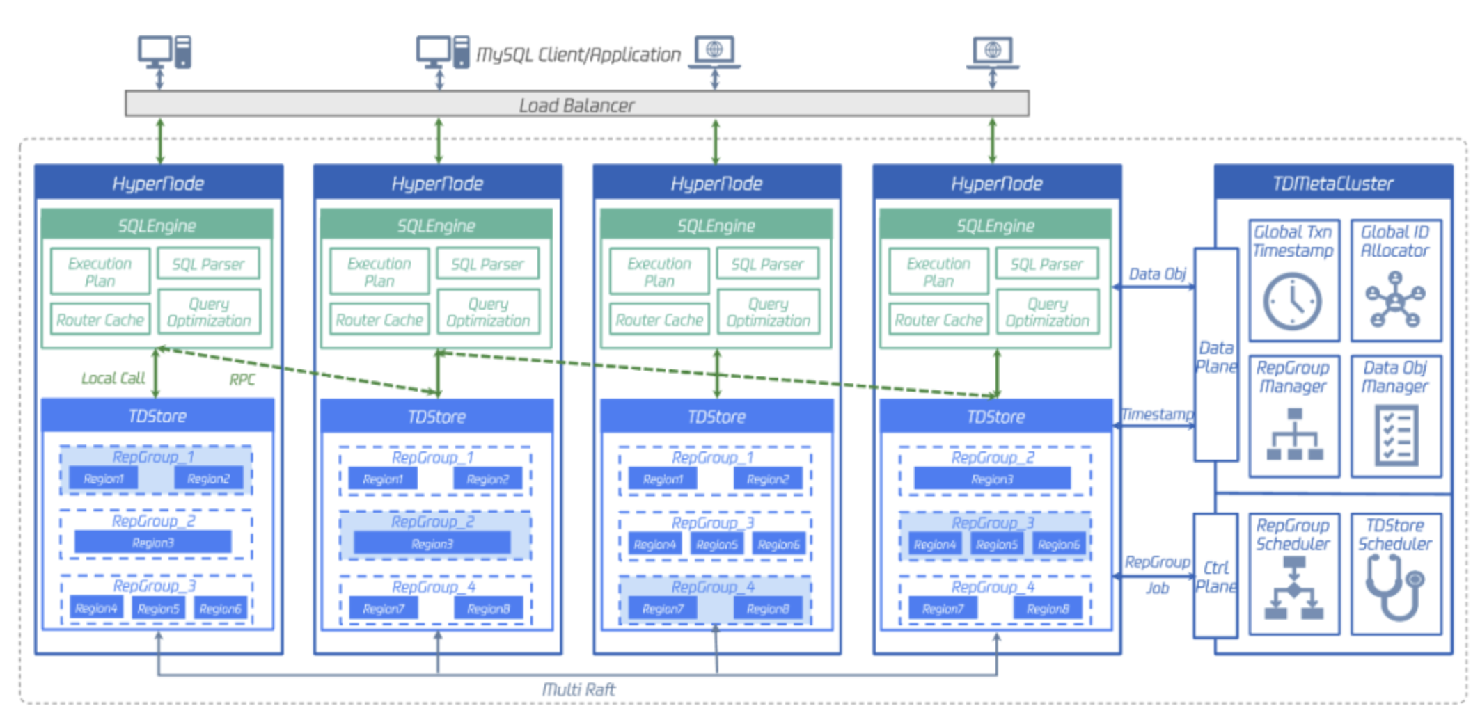The HyperNode on the left is a peer node, also known as a hybrid node: Each node comprises two components—the computing layer (SQLEngine) and the storage layer (TDStore). The SQLEngine layer is responsible for SQL parsing, query plan generation, query optimization, and so on, and sends transaction-related read/write requests to the underlying TDStore.