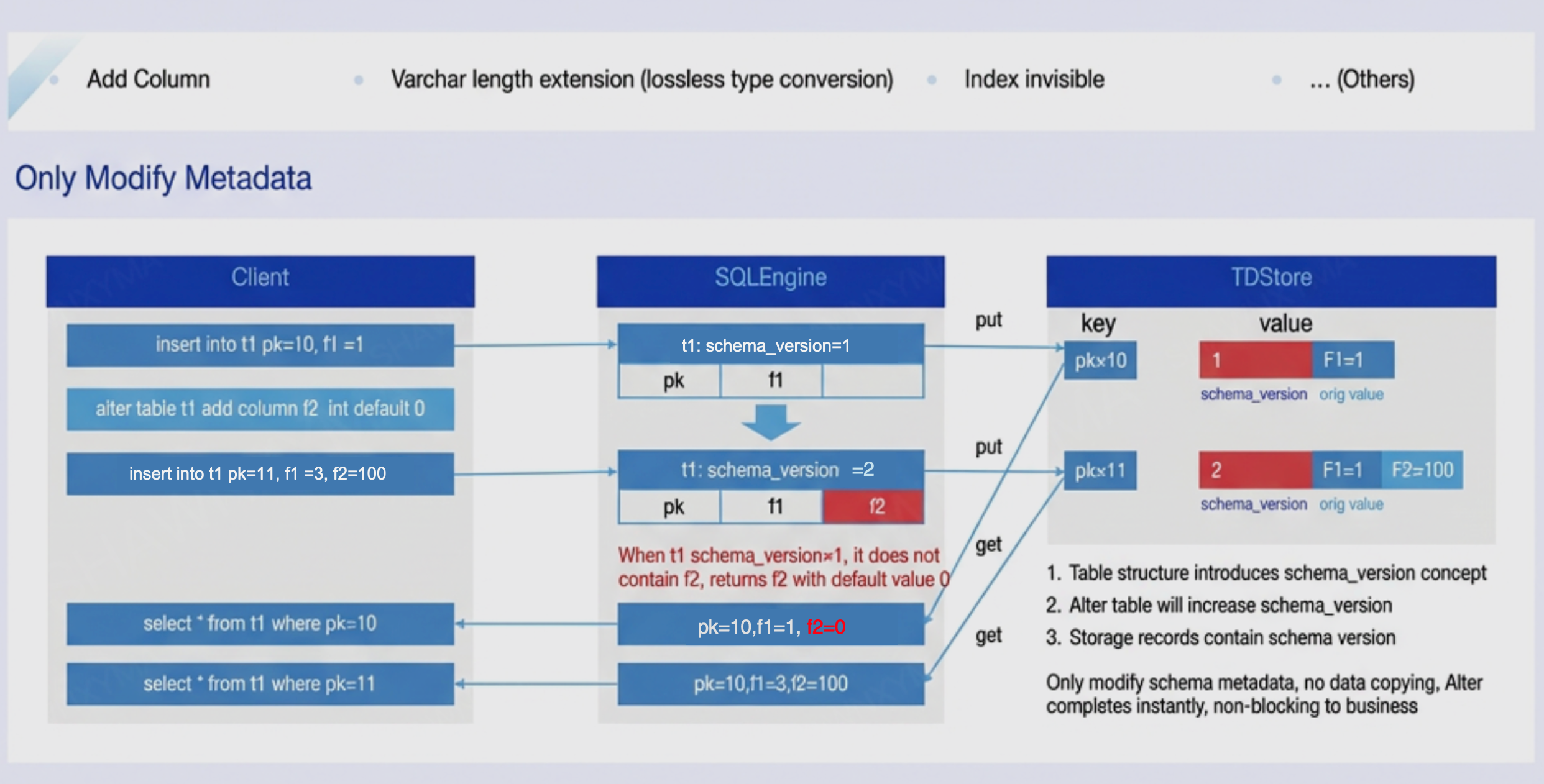 By introducing the concept of a version number (schema version) in the table structure. As shown in the figure above, table t1 initially has version 1; after a column is added, the version number becomes 2. New data rows carry the version number upon insertion. During data reading, the row version must be checked first: if the row version is 2, the current table structure is used for parsing; if the row version is 1 (lower than the current version), after it is determined that column F2 is absent in this version's schema, the default value is populated directly before returning to the client. This multi-version schema parsing mechanism enables non-destructive type changes—such as adding columns or extending varchar length—to complete instantly by modifying metadata only.