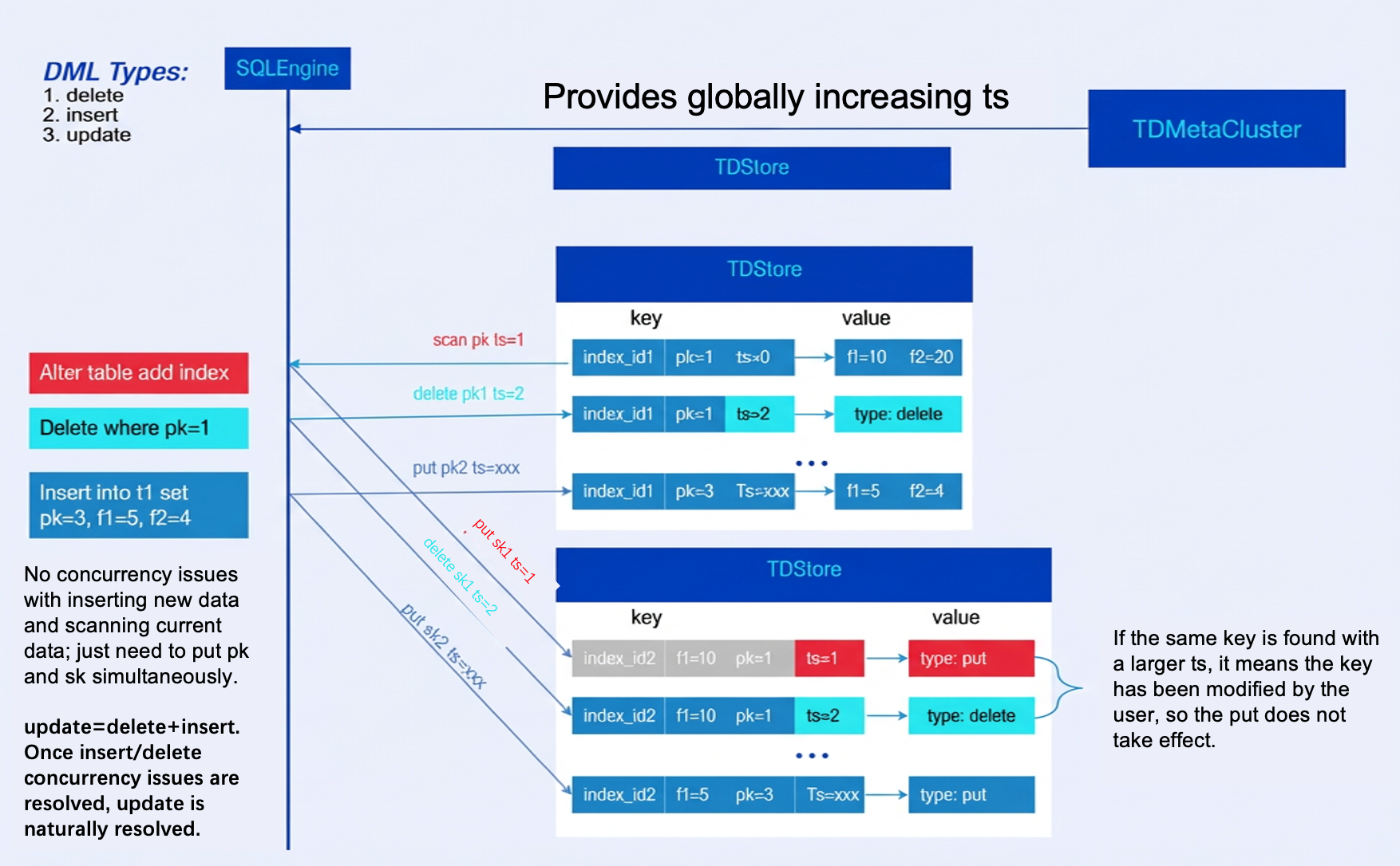 2. By introducing (Thomas Write Rule) to resolve concurrency control issues between DDL requiring data backfill and DML: