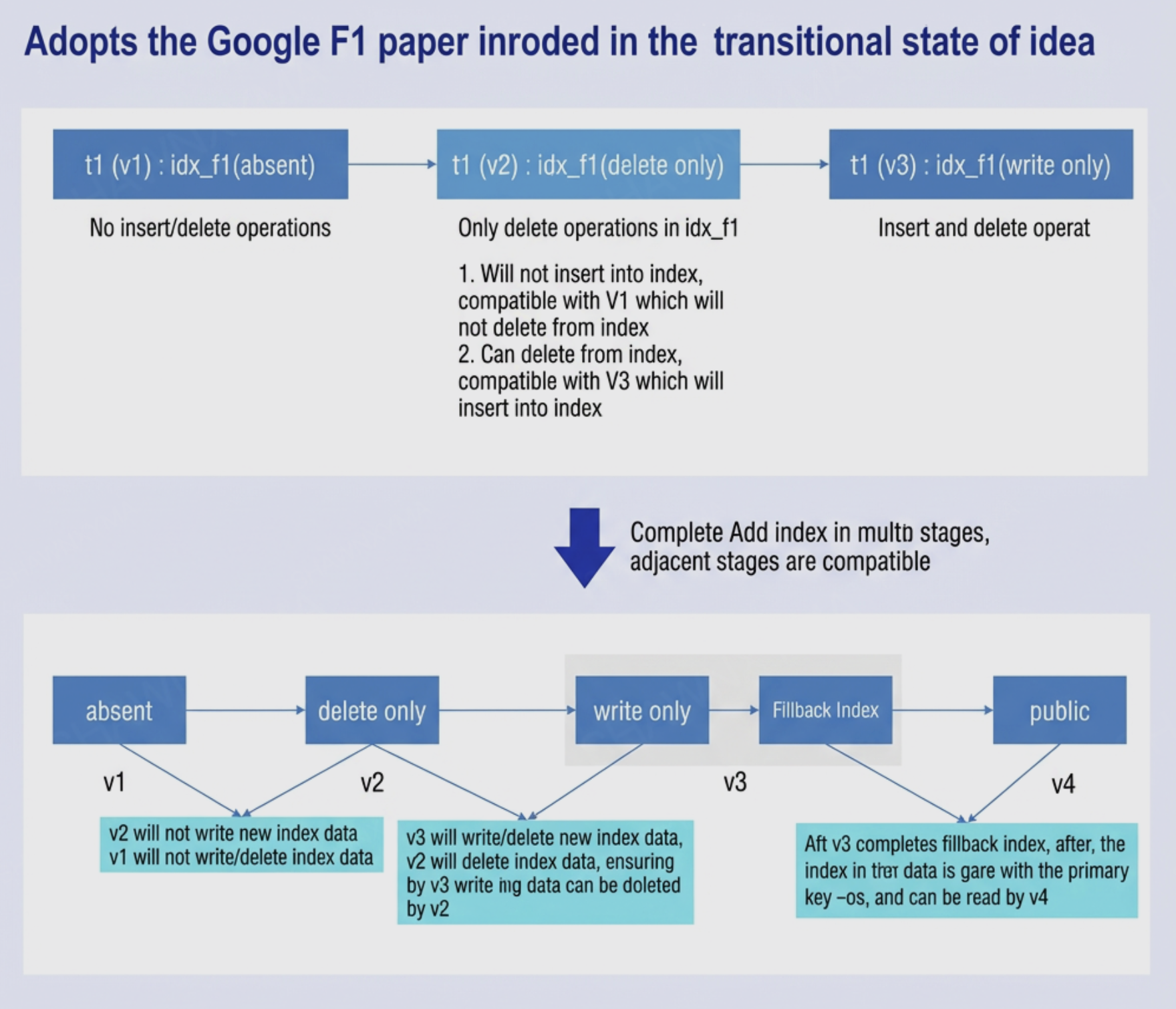 The fundamental concept abstracted from this: when an action cannot immediately transition from one state (before adding an index) to another (after adding an index), transitional intermediate states can be introduced to ensure compatibility between adjacent states. Although entities cannot instantly enter a specific state, as long as they remain within two compatible states and maintain compatibility while progressively advancing through state transitions, they can gradually reach the final state and complete the entire transition.