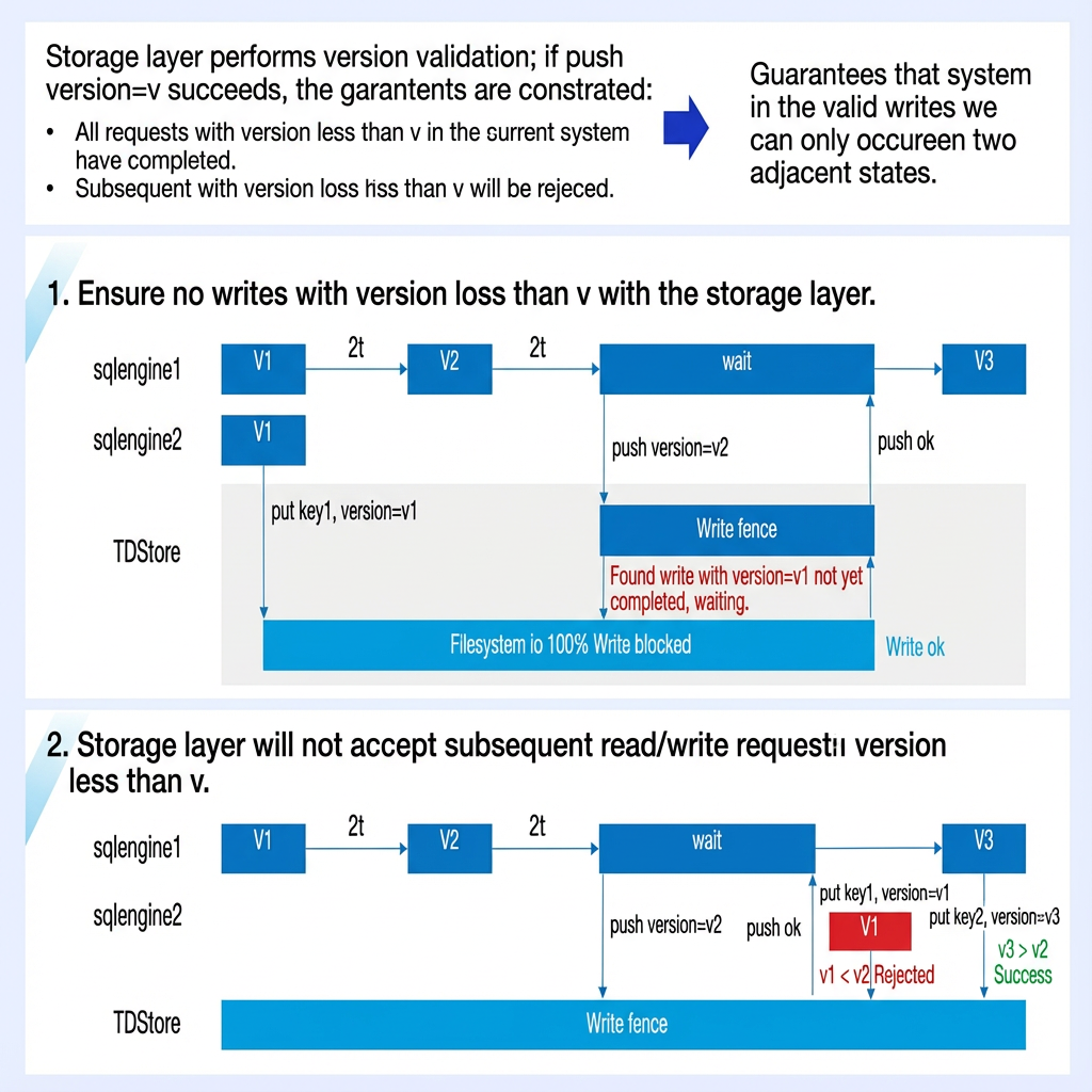 4. By incorporating the concept of transitional states, a Write Fence mechanism is designed: Through version verification of requests at the storage layer, it ensures that successful writes from multiple SQLEngines can only occur between two adjacent states at any given moment, preventing data inconsistency.