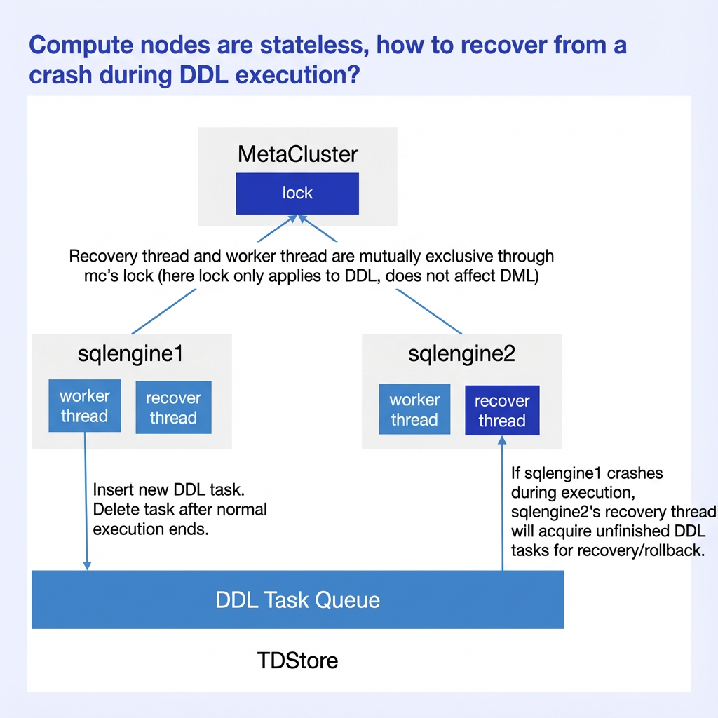A DDL job queue + DDL recovery thread are introduced to ensure crash-safe for DDL. Note that the recovery thread operates independently from worker threads and does not wait for communication from each other. If execution fails due to network issues, the recovery thread takes over (the recovery thread may not reside on the same node as the original worker thread). Monitoring the DDL job queue is straightforward: query the INFORMATION_SCHEMA.DDL_JOBS system table and verify the final execution status via the DDL_STATUS field.