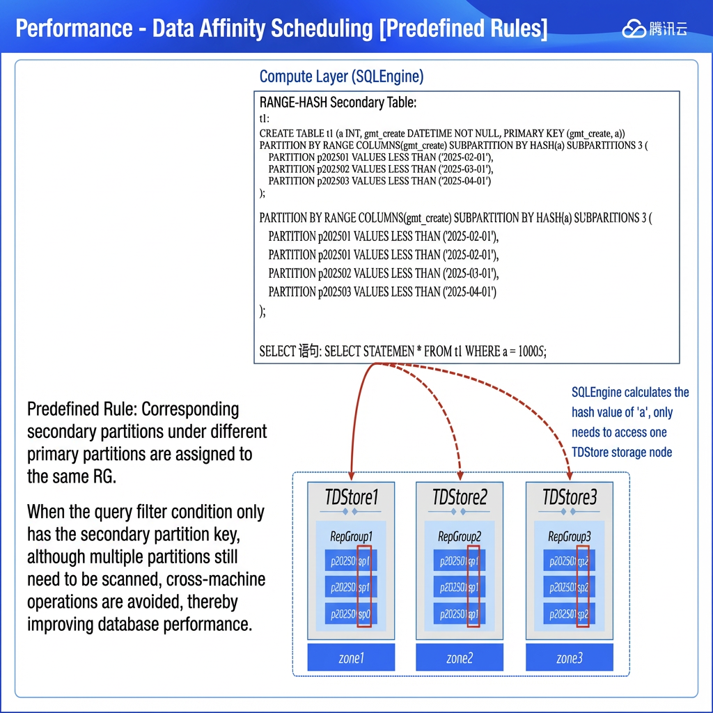 TDSQL Boundless is in a period of rapid development, with all features being user-demand-oriented and undergoing continuous rapid iteration and refinement. We are still continuously optimizing the data intelligent scheduling feature. The current version has pioneered adaptation of implicit partition affinity for commonly used primary HASH-partitioned tables. In future releases, we will further extend support for implicit partition affinity covering primary KEY-partitioned tables and range/list + hash secondary partitioned tables. Simultaneously, we will introduce flexibly customizable explicit partition affinity policies, with initial support for specification of explicit affinity for primary HASH-partitioned tables and regular tables.