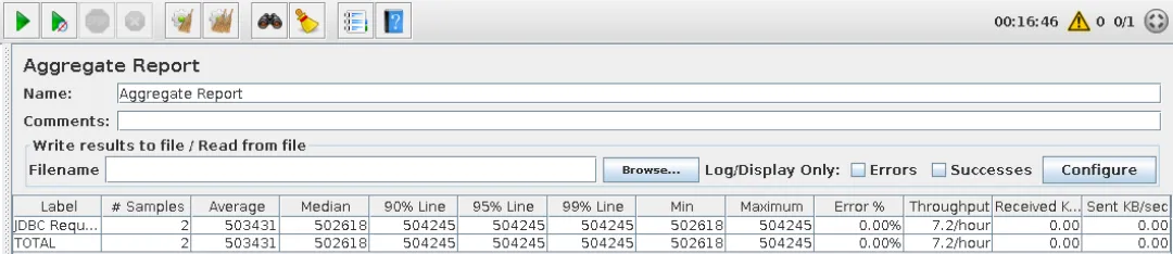 Single process, continuously executed for 16 minutes and 46 seconds, during which 2 requests were completed, with an average response time of 8 minutes and 23 seconds, the execution efficiency differs by a full 113 times.