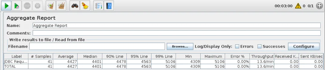 Single process, continuously executed for 3 minutes, completing 41 requests during this period with an average response time of 4.4s: