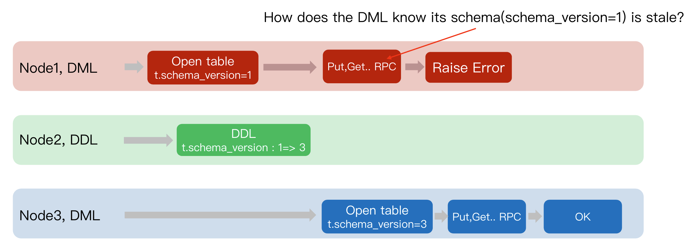 3. Node3 (DML): Open table -> Obtain t.schema_version=3 -> Initiate Put/Get RPC(data, version=3) -> Region Leader verifies 3 == 3 -> OK.