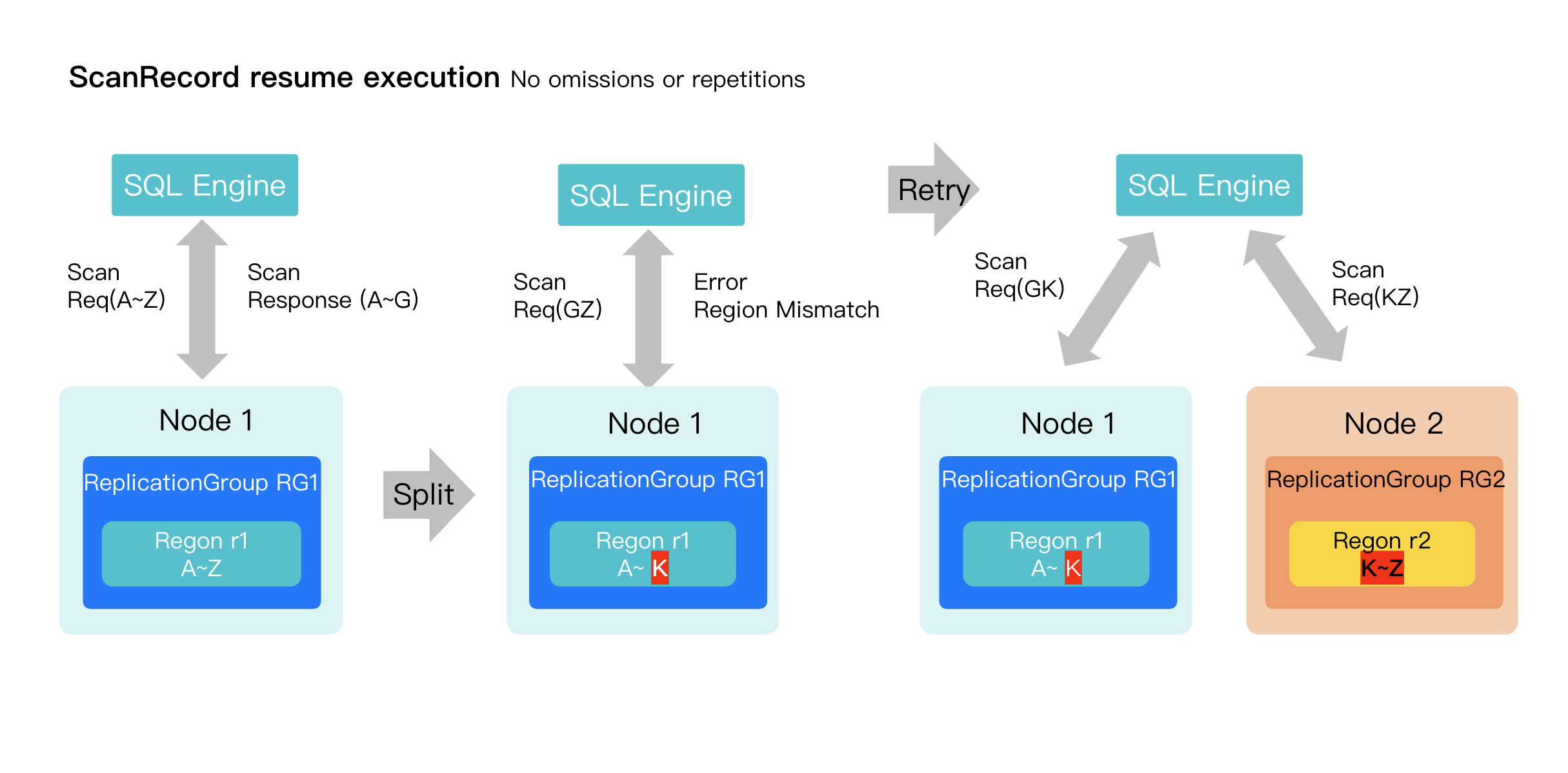 Splitting the request: The executor splits the remaining work, sending a request for 'G'-'K' to Region1 and 'K'-'Z' to Region2.