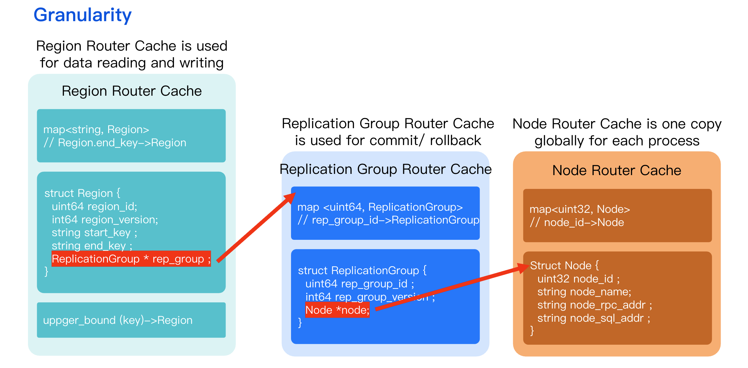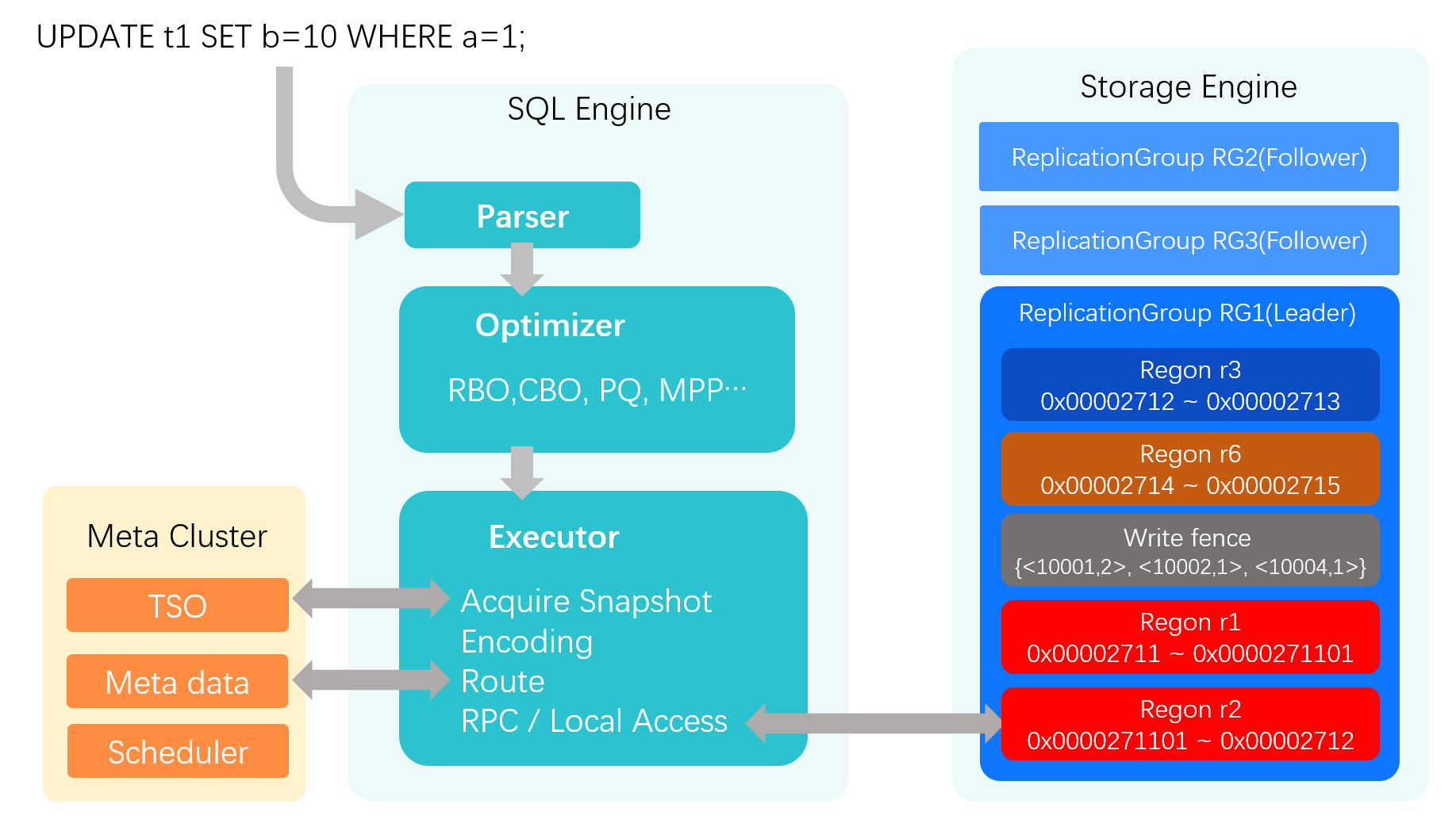 Replication Group (RG) Metadata (Yellow): Contains the Region version to validate the route. If the storage node receives a request with a stale version, it means the client used an outdated route. It rejects the request, forcing the SQL engine to refresh its route from the MC and retry.