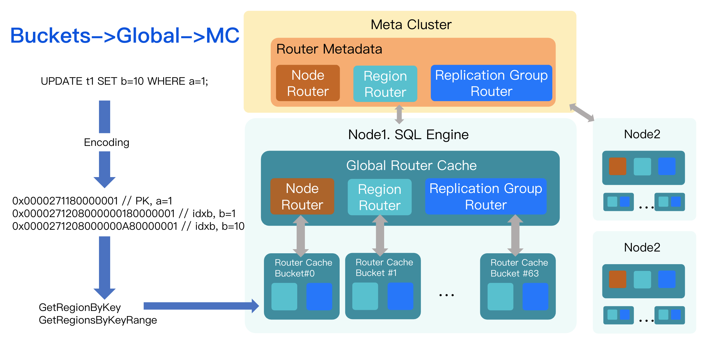 After encoding the keys, the executor must determine which storage node holds the data for each key. This is the responsibility of the routing layer. In TDSQL Boundless, the Metadata Center (MC) maintains the global routing map, which is essentially a mapping from key ranges to the nodes that store them.
