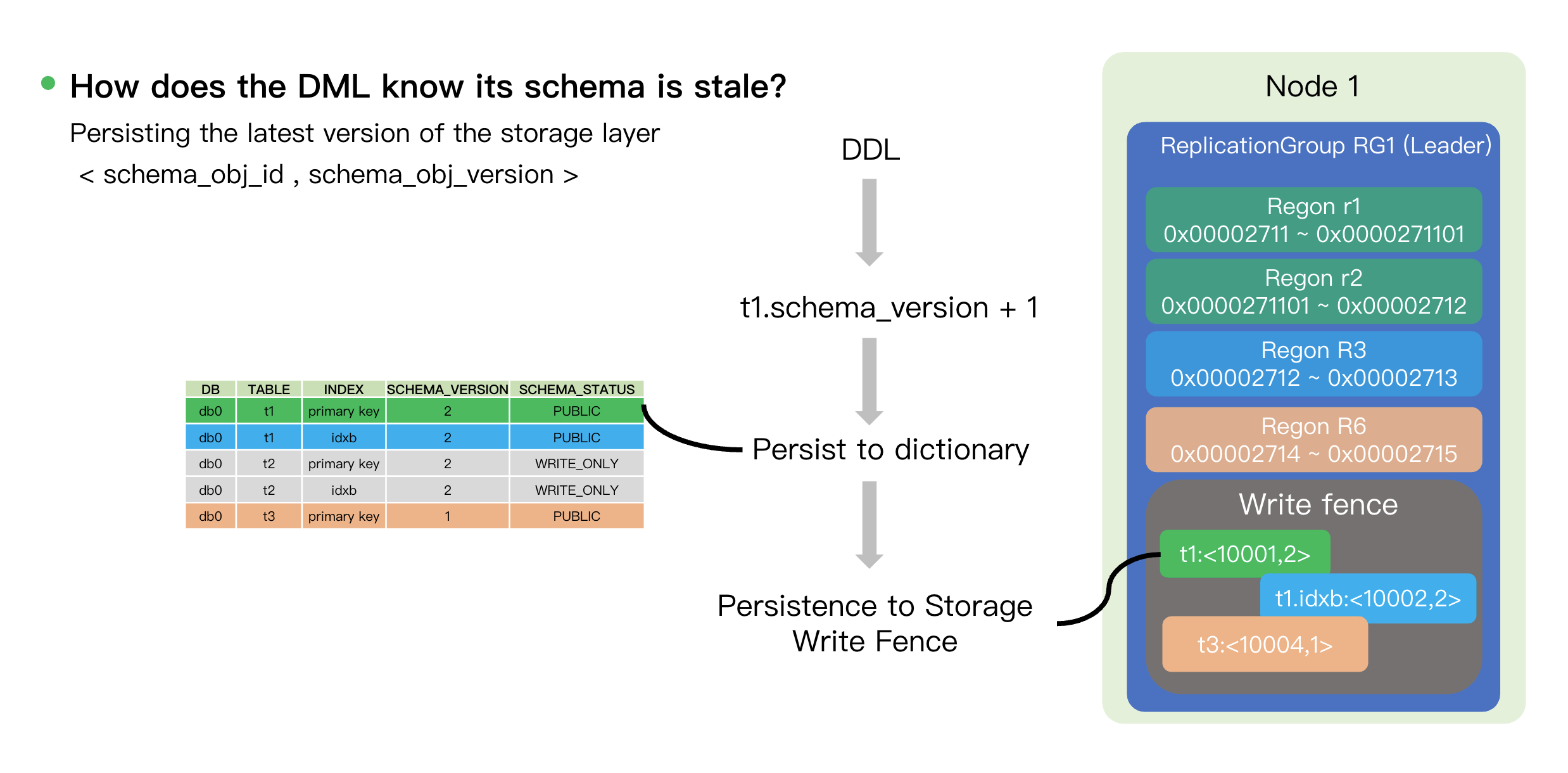 In a distributed environment, we use a mechanism called the Write Fence to prevent DML from writing data using a stale schema. Process for Distributed Coordination: