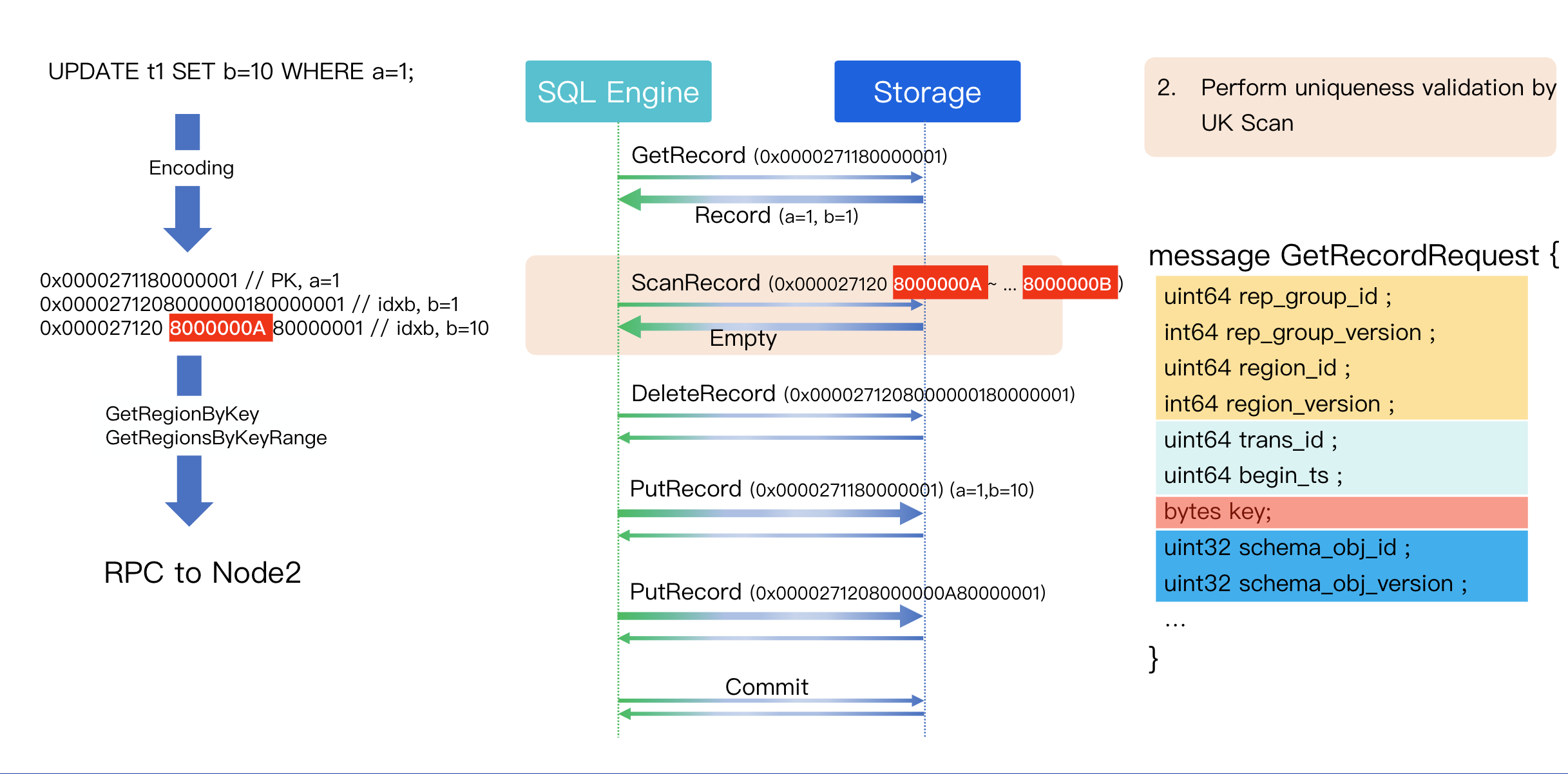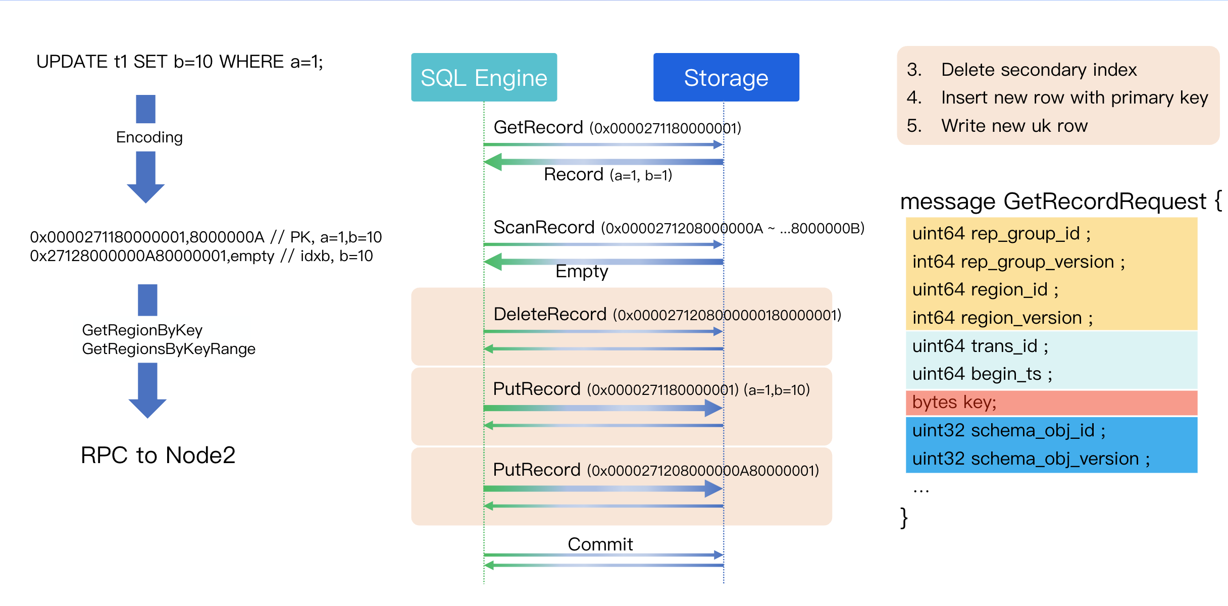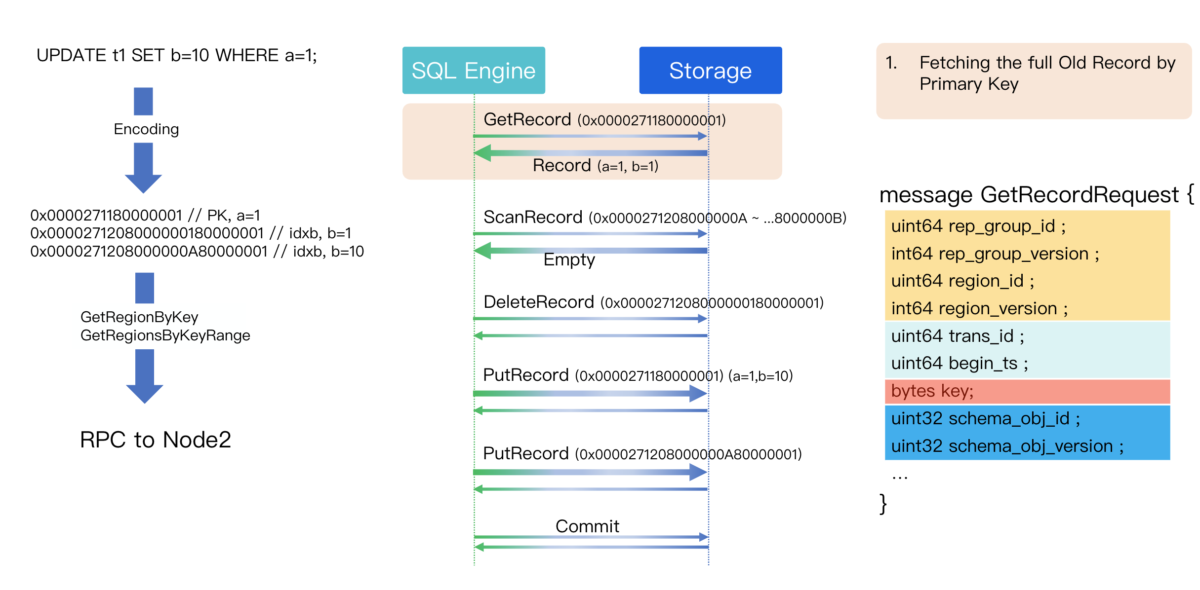 First, we issue a Get operation on the primary key (a=1) to fetch the complete old version of the row. The GetRecord RPC message contains four main parts: