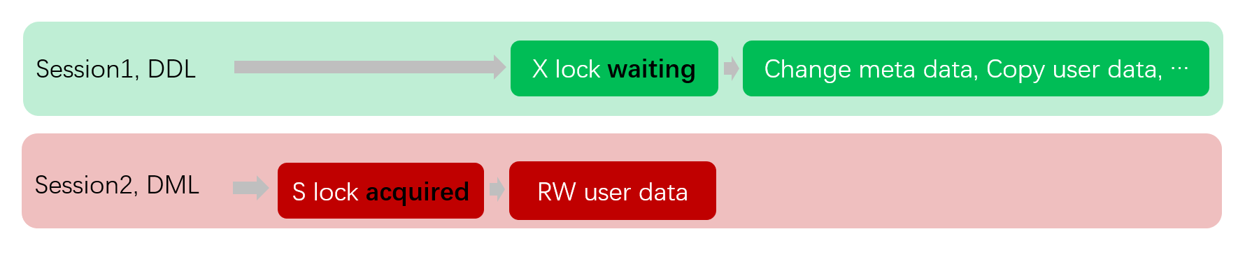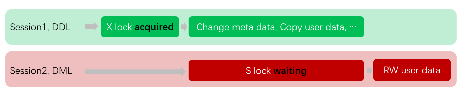 3. Since the S lock and X lock are mutually exclusive, Session2 must enter the waiting state until Session1's DDL operation fully completes and releases the X lock.