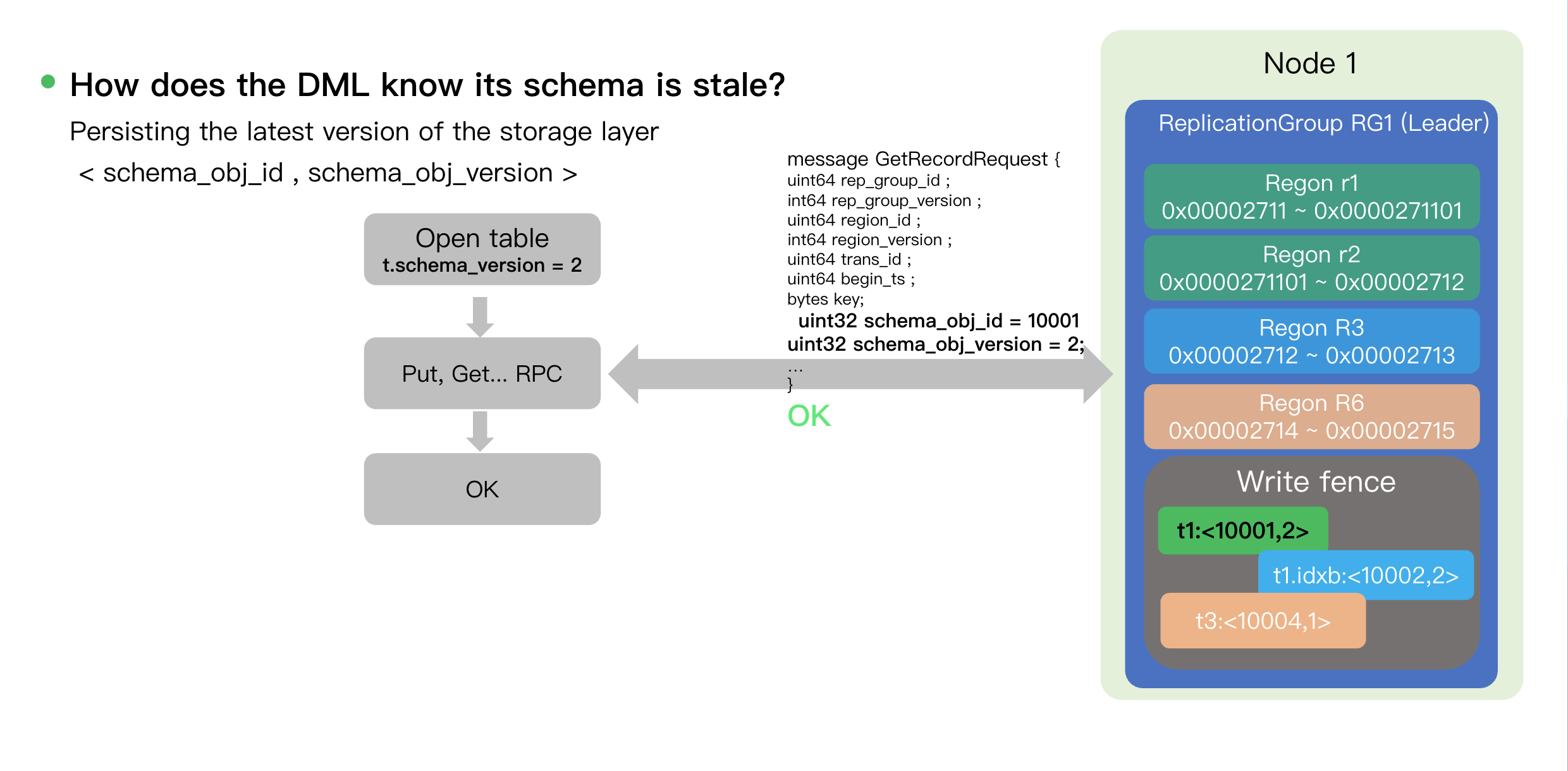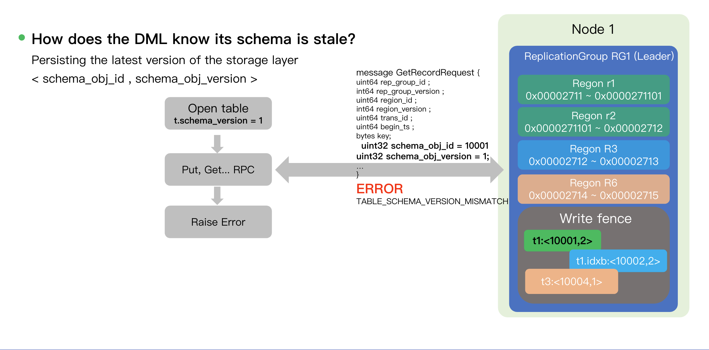 4. Node1 (DML): Initiate Put/Get RPC(data, version=1) -> Region Leader verifies 1 != 3 -> Rejects the request and returns Raise Error.