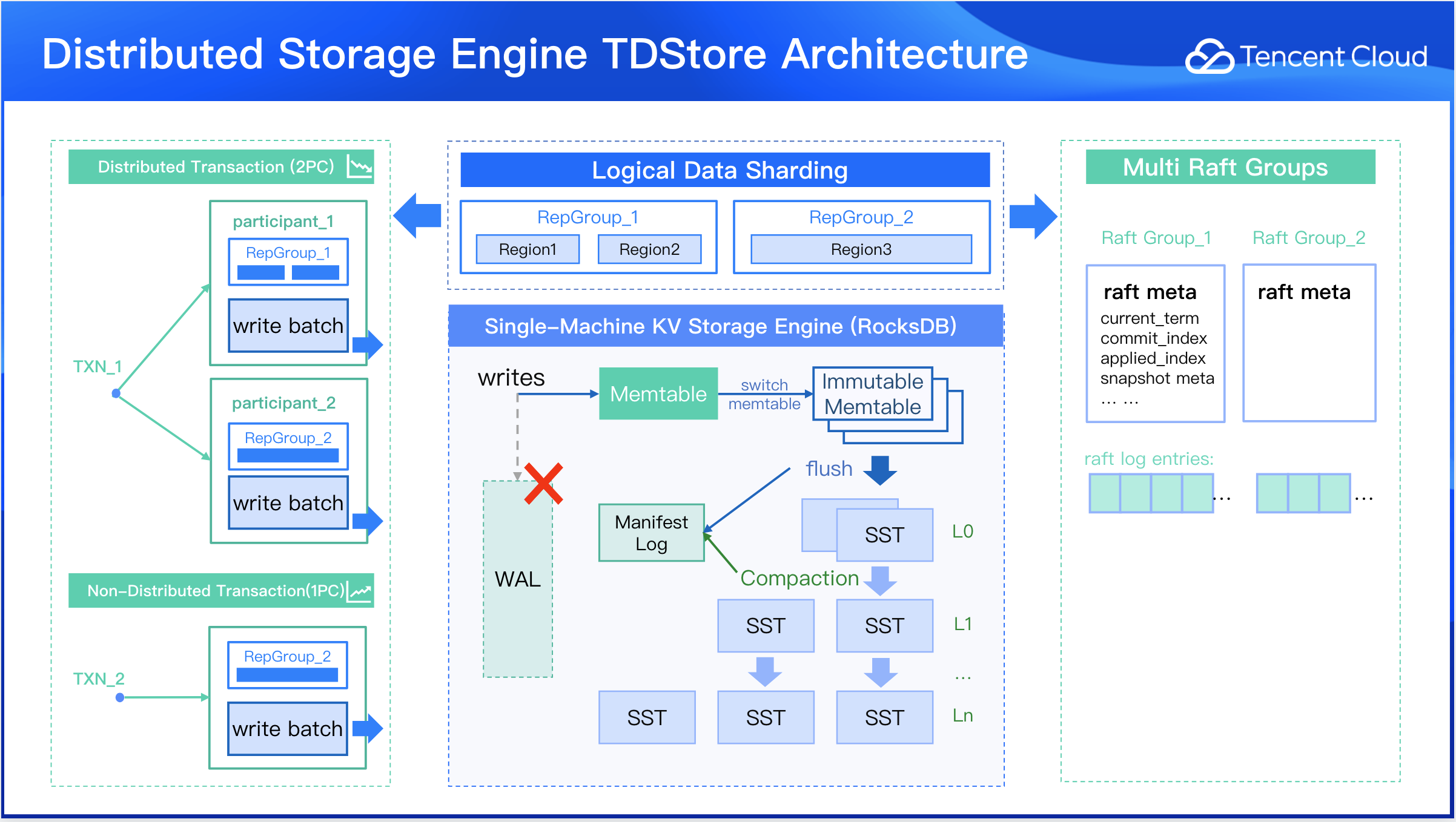 TDStore is the storage engine that powers TDSQL Boundless. It is a distributed storage engine built upon RocksDB. By incorporating a data sharding module and a distributed transaction module in its upper layers, and integrating Raft consensus protocol module in its lower layer, TDStore transforms a single-machine RocksDB into a distributed KV storage engine. This architecture delivers high scalability, high availability, distributed transactions, automatic data balancing scheduling, strong consistency across multiple replicas.