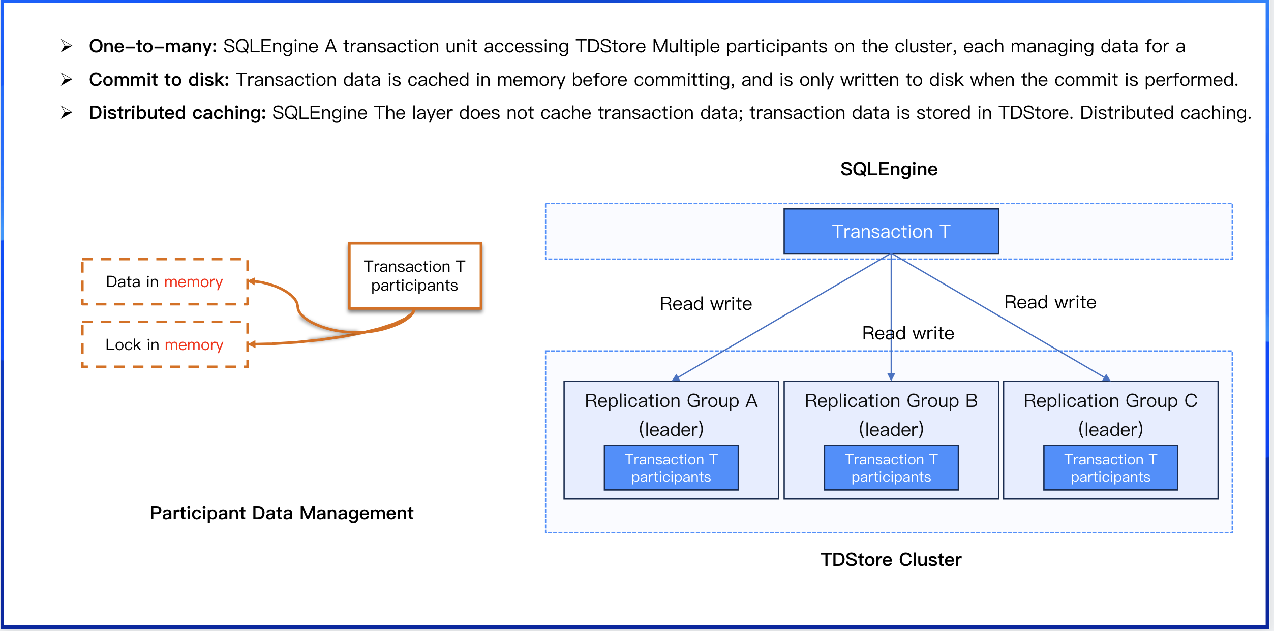 Participant Management: Manages transaction participants with the replication group (RG) as the basic unit. When a transaction needs to access data of a specific replication group, it automatically creates the corresponding participant context. A transaction unit of SQLEngine accesses multiple participants on the TDStore cluster, with each participant managing the data of one Replication Group.
