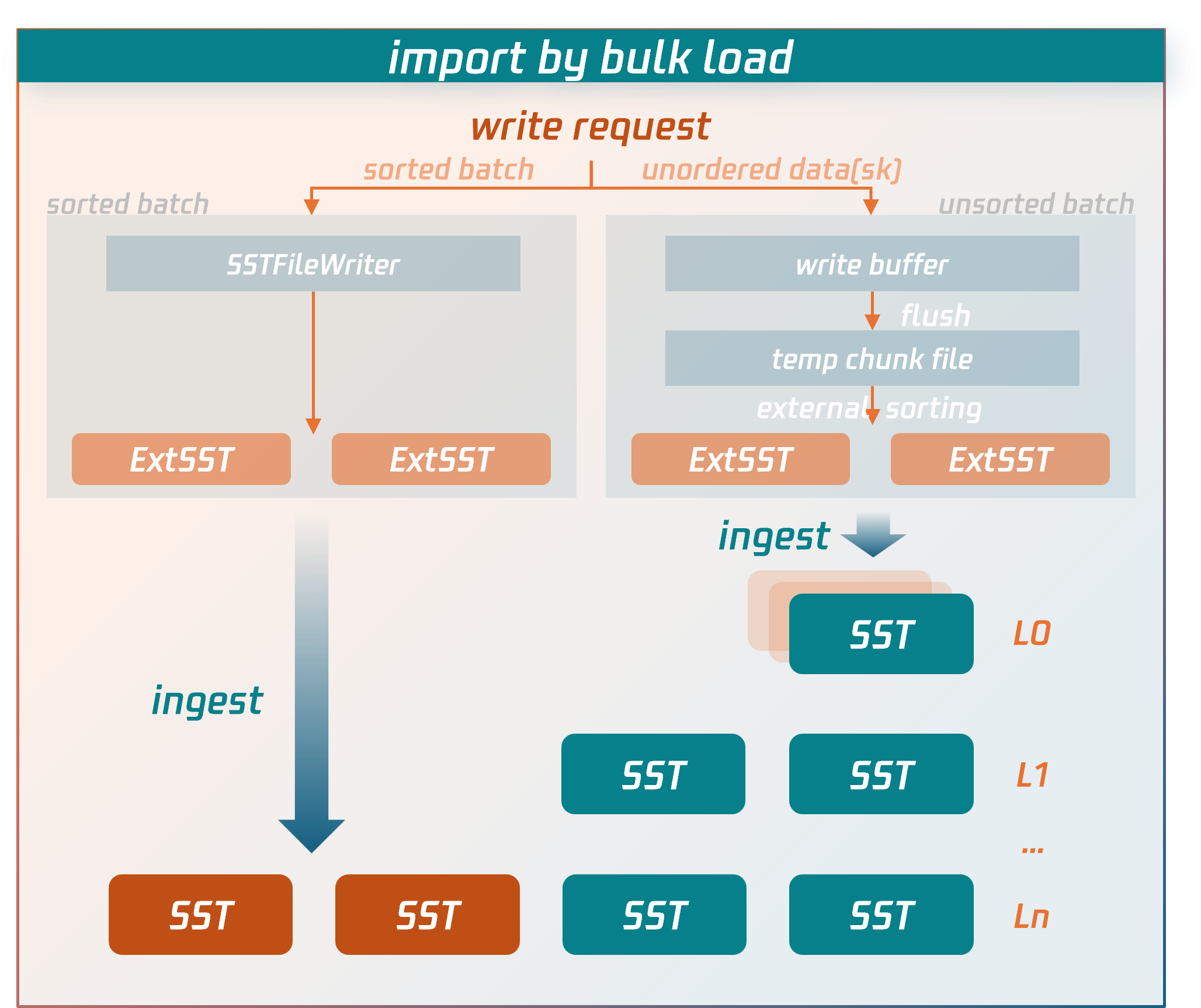 For unsorted data: it is first written to temporary data files, then undergoes an external merge sort to generate external SST files.