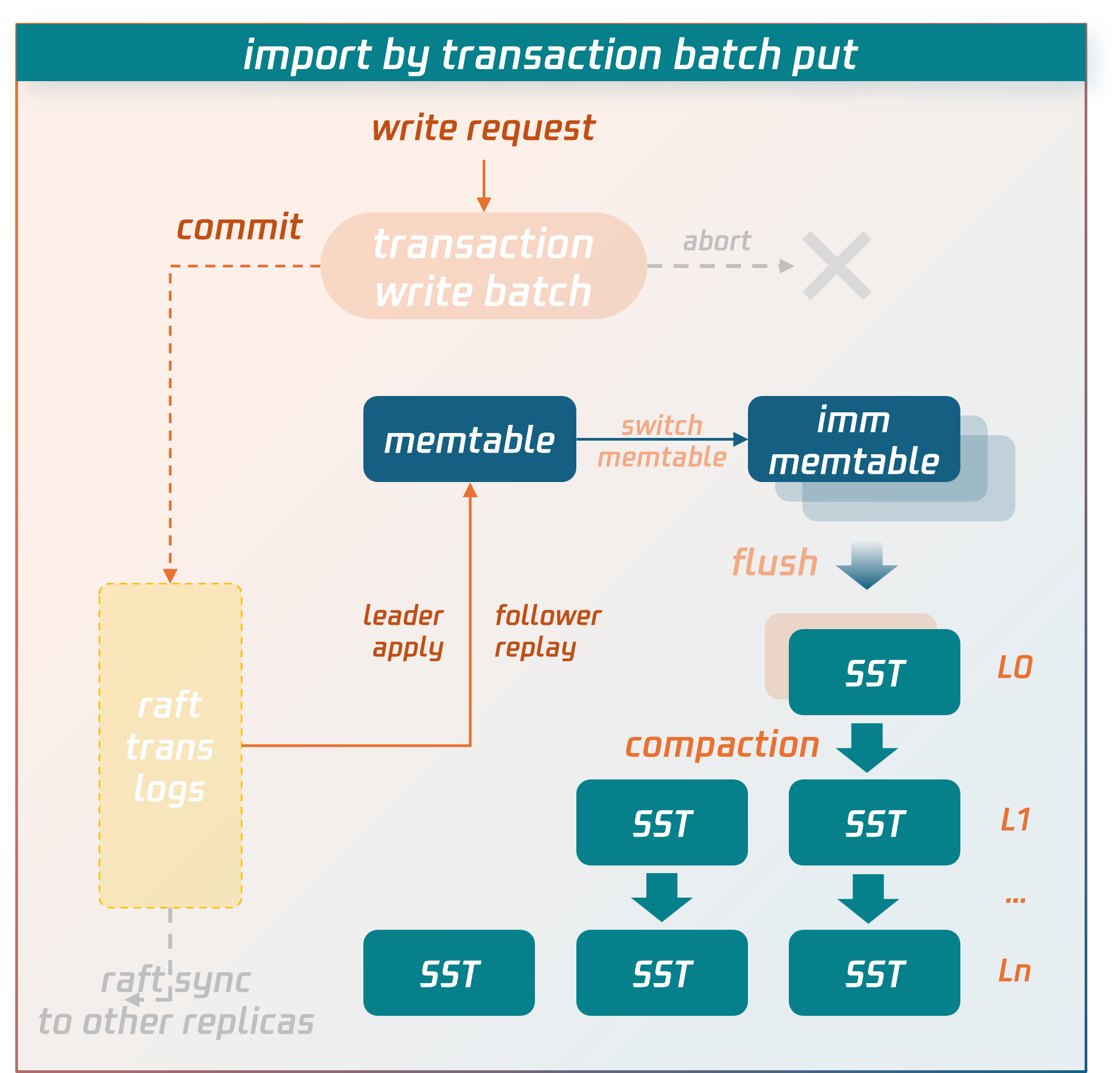 Data is temporarily stored in the transaction context's write batch before commit. After the commit phase is entered, the data in the write batch is first persisted to disk as transaction logs and synchronized to replica nodes via the raft protocol. After majority consensus is achieved, the data is written into the memtable structure in memory. When the memtable fills up, it flushes to disk to form SST data files. SST files are organized into levels using an LSM-tree structure. Asynchronous background threads perform compaction operations to merge and clean the data.