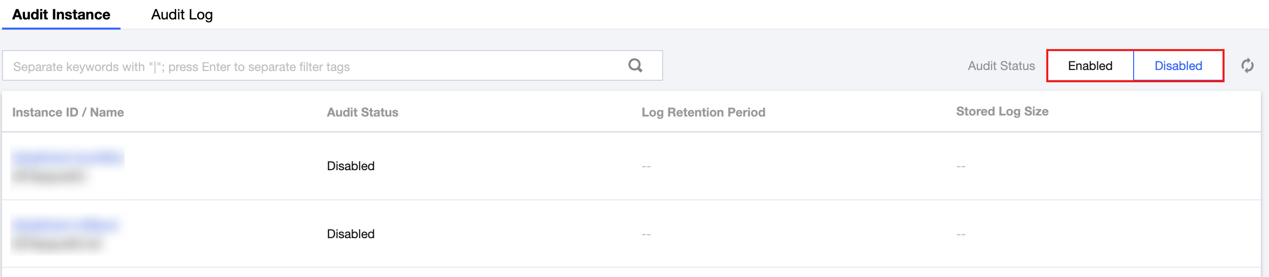 3. On the Audit Instance page's instance list, select the instances that need to enable/disable audit service, and configure audit settings for the instances.