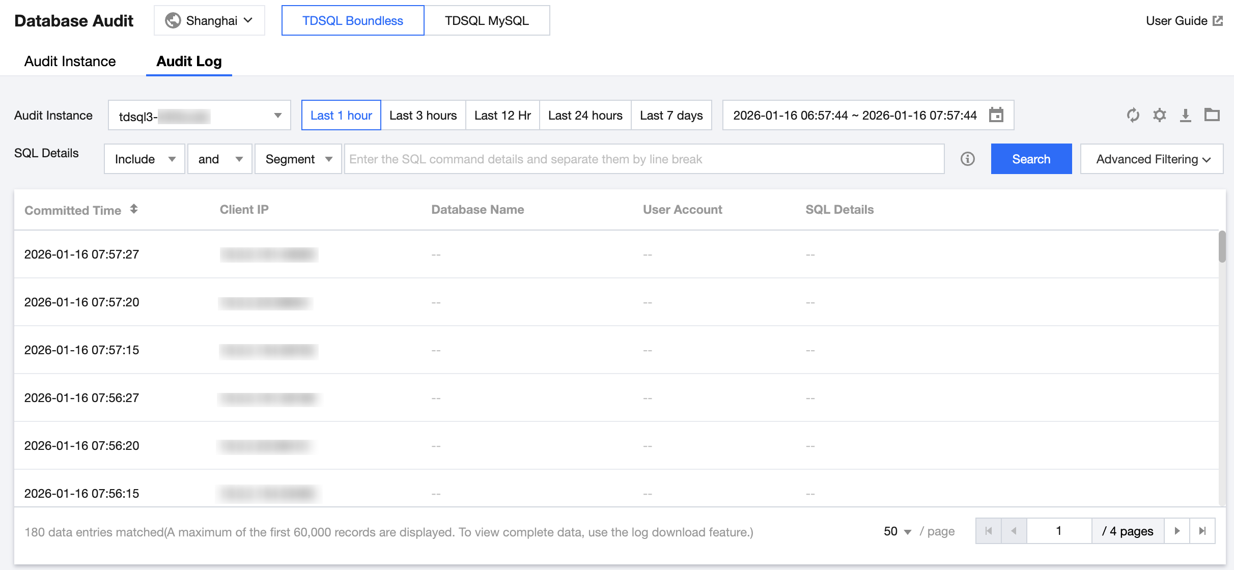 After audit is enabled, you can view the corresponding audit logs for SQL on the Audit Log page.