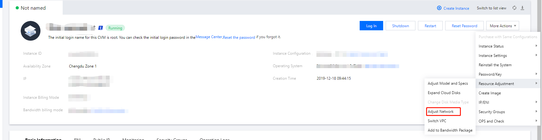 아래 이미지와 같이 타깃 CVM 인스턴스 페이지의 오른쪽 상단에서 더보기 > 리소스 변경 > 네트워크 변경을 선택합니다.