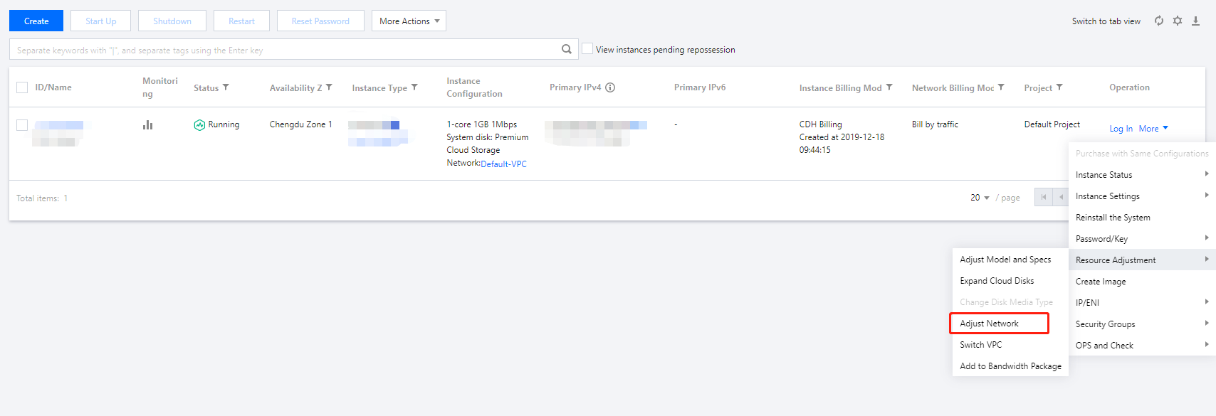 아래 이미지와 같이 타깃 CVM 인스턴스가 있는 행의 오른쪽에서 더보기 > 리소스 변경 > 네트워크 변경을 선택합니다.