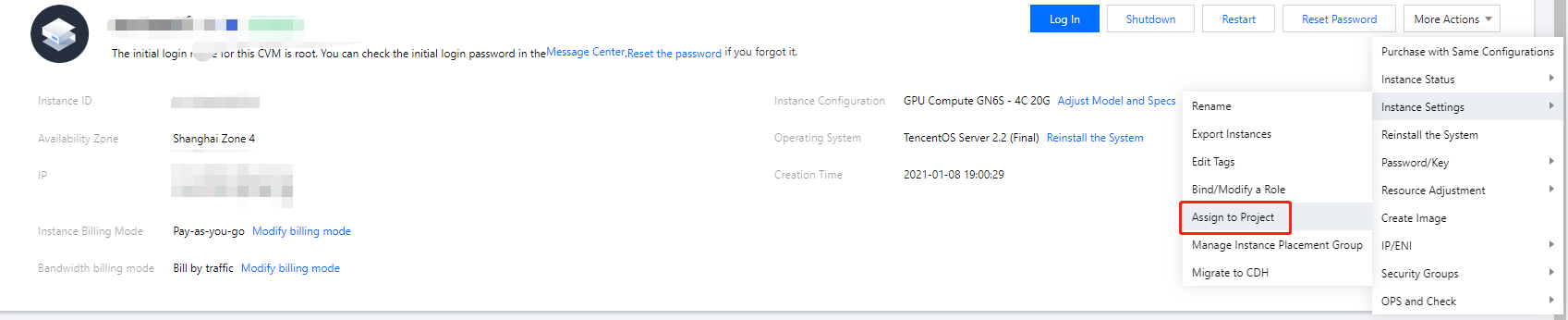 새 프로젝트에 재할당해야 하는 클라우드 서버가 여러 개인 경우 클라우드 서버를 선택하고 상단에서 더 많은 작업 > Instance Settings > 프로젝트에 할당을 선택합니다.