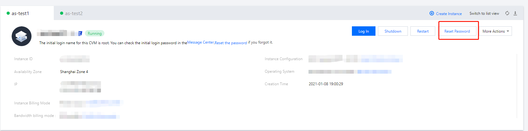 탭 뷰: 아래 이미지와 같이 비밀번호를 재설정할 CVM 페이지에서 비밀번호 재설정을 클릭합니다.