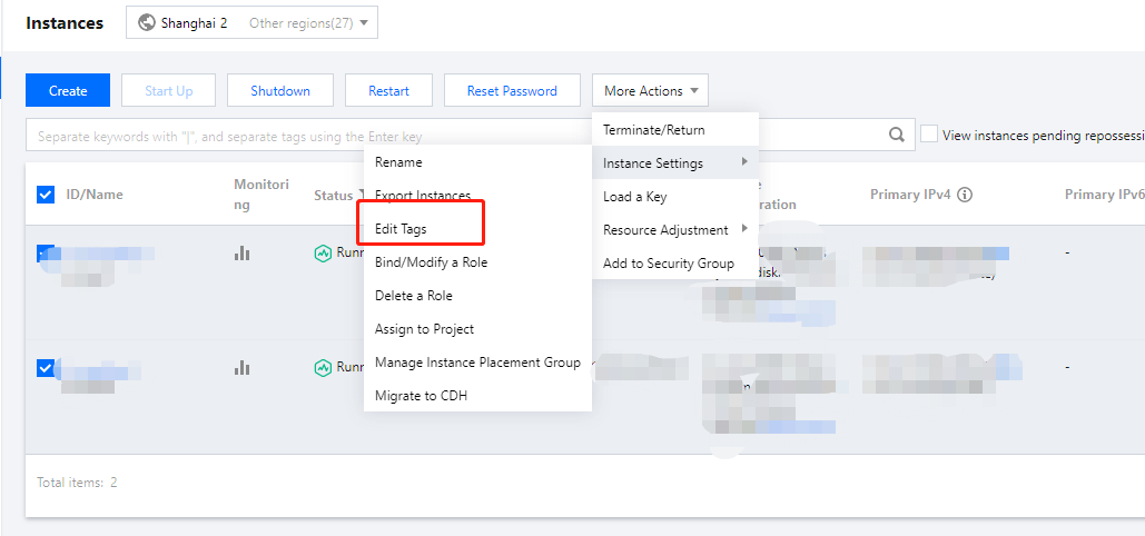 리스트 뷰: 아래 이미지와 같이 태그를 편집할 인스턴스를 선택하고 더보기 > 인스턴스 설정 > 태그 편집을 선택합니다.
