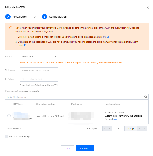 4. 리전을 선택하고 작업 이름, COS 링크 및 마이그레이션할 CVM 인스턴스와 같은 구성 정보를 입력합니다. 다음 이미지 참고: