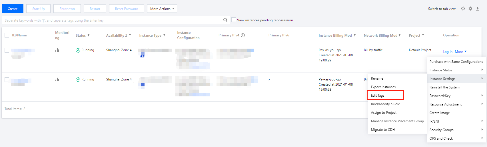 아래 이미지와 같이 태그를 편집할 인스턴스를 선택하고 더보기 > 인스턴스 설정 > 태그 편집을 선택합니다.