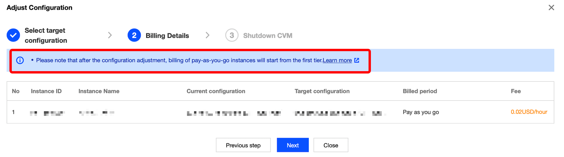 사용량 과금 인스턴스: 아래 이미지와 같이 새로운 사양 적용 시 동결해야 하는 금액을 확인합니다. 설정 변경 후, 종량제 요금이 첫 단계부터 적용되므로 관련 규칙을 자세히 확인한 뒤 작업을 진행하십시오.