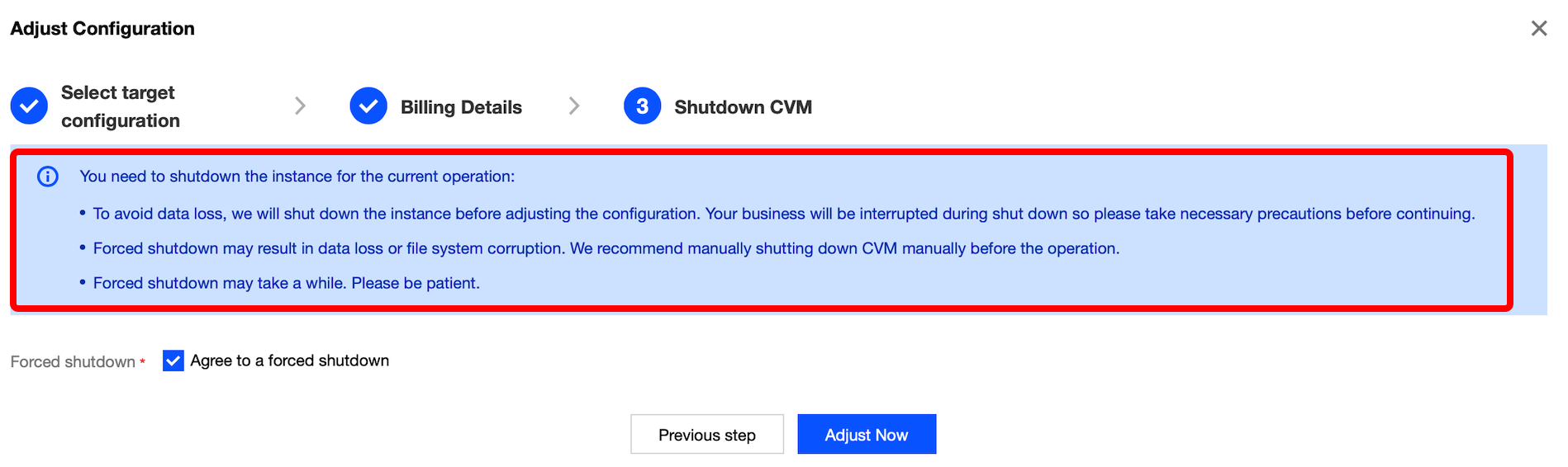 설정 다운그레이드 시, 요금 환불 관련 세부 정보를 확인하십시오. 강제 종료 및 재시작 후 새로운 설정이 적용되며, CVM는 새로운 설정으로 즉시 실행됩니다.