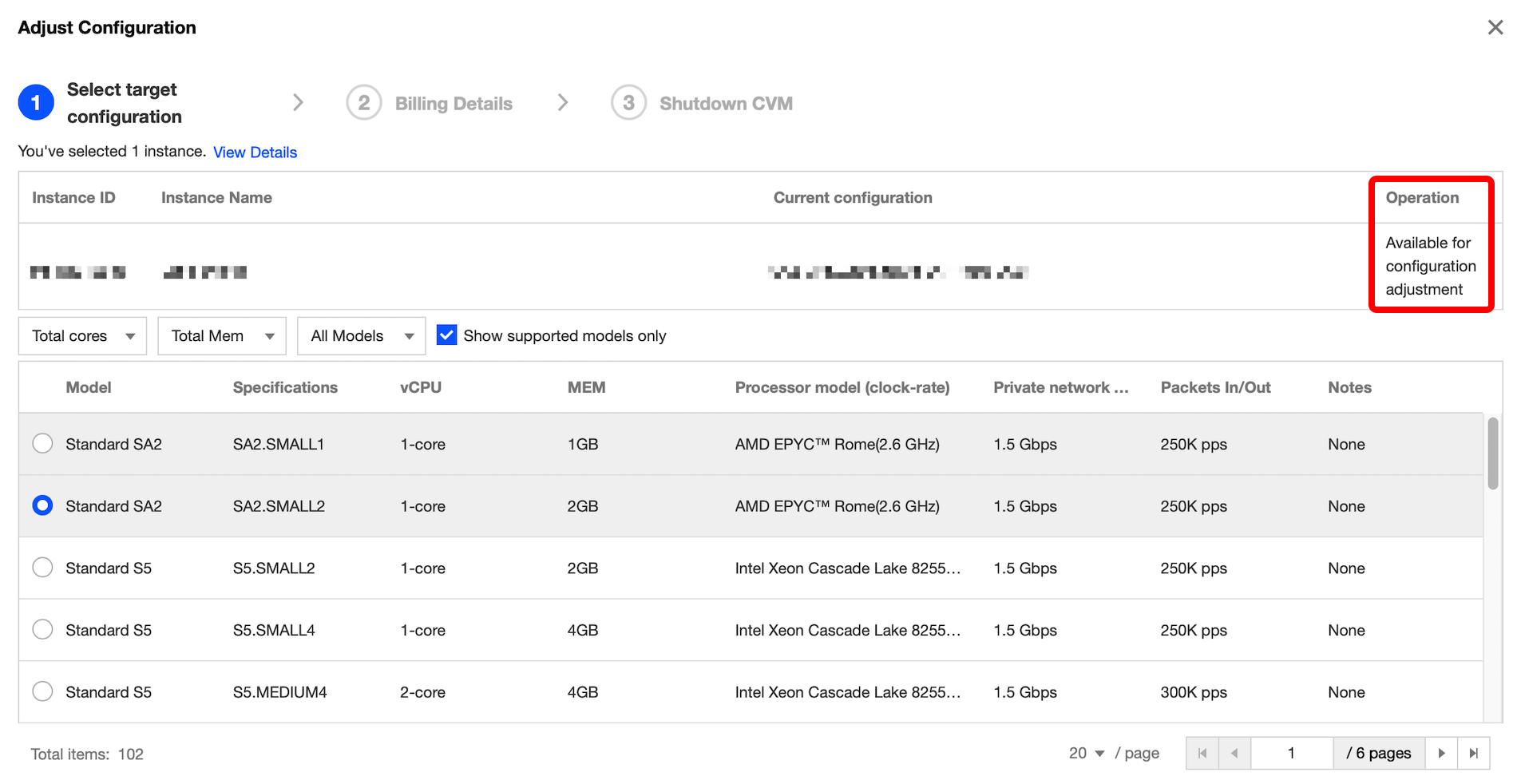 3. 아래 이미지와 같이, '타깃 설정 선택'에서 인스턴스 상태 및 작업을 확인한 뒤, 필요한 모델 및 인스턴스 사양을 선택하고 사양 및 성능 매개변수를 자세히 확인합니다. 확인이 끝나면 다음을 클릭합니다.