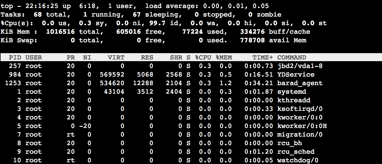 첫째 줄: 시스템 현재 시간, 현재 로그인 사용자 개수 및 시스템 부하.
