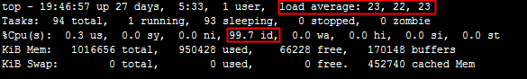 top 명령이 실행된 후 다음과 유사한 정보가 반환되어 CPU 사용량은 낮지만 load average는 매우 높음을 나타냅니다.