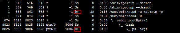 다음 명령을 실행하여 아래와 같이 D 상태에 있는 프로세스가 있는지 확인합니다.
